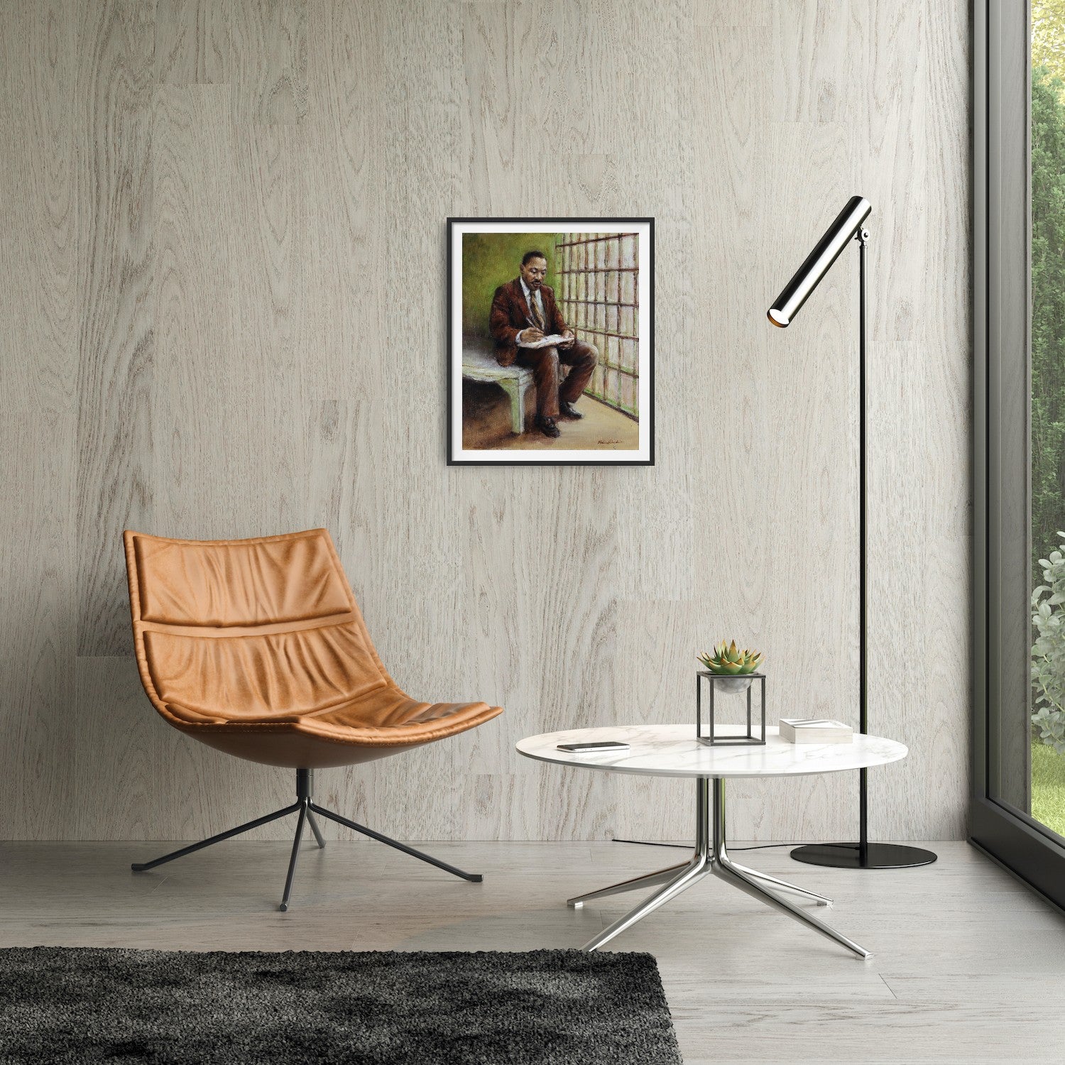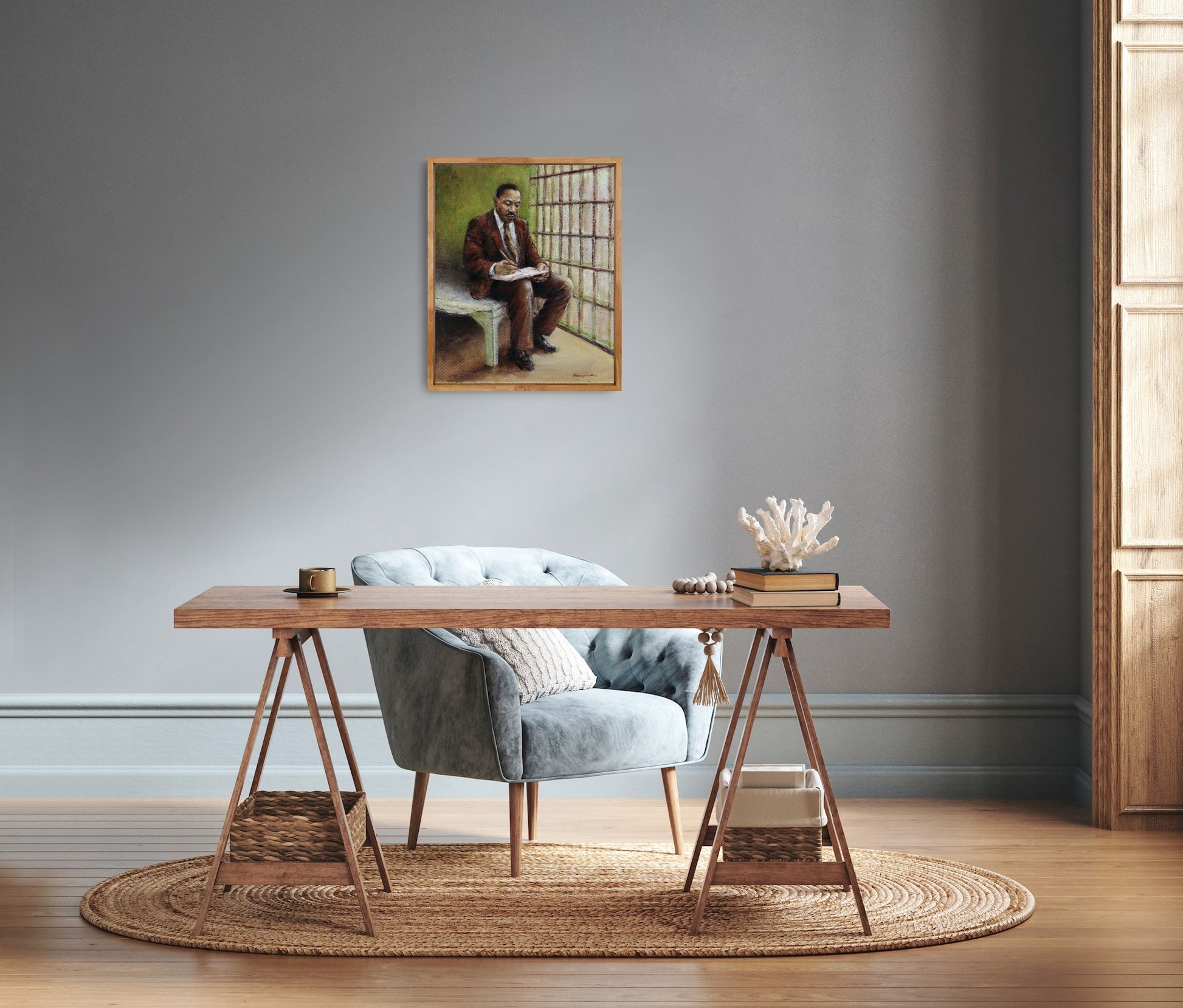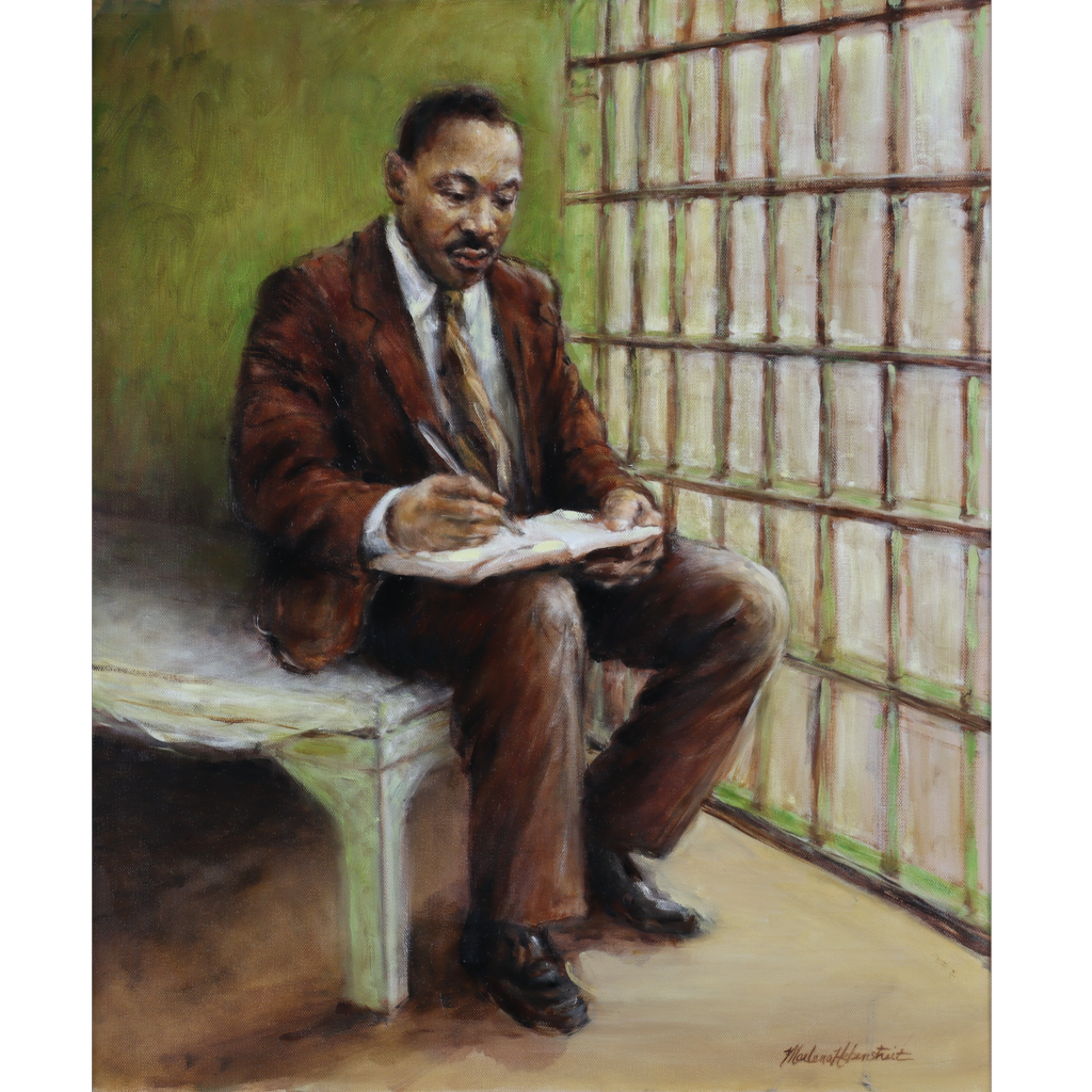 Marlena's paintings capture the spirit of history. In this one, we see Martin Luther King Jr penning his famous letter from the Birmingham Jail, a powerful statement of his nonviolent resistance. The artist signed this painting, which is on display at The Art Enclave Gallery.