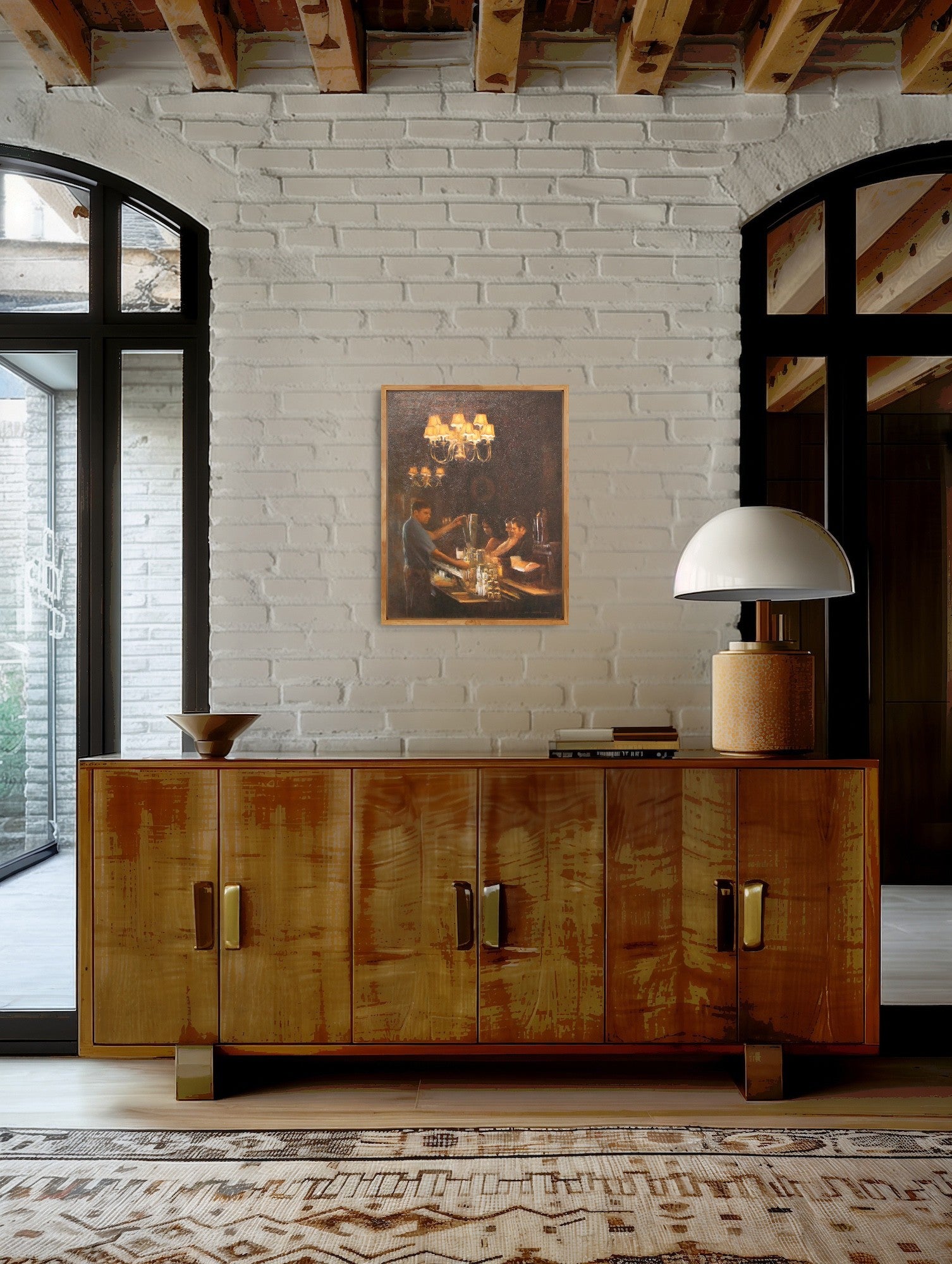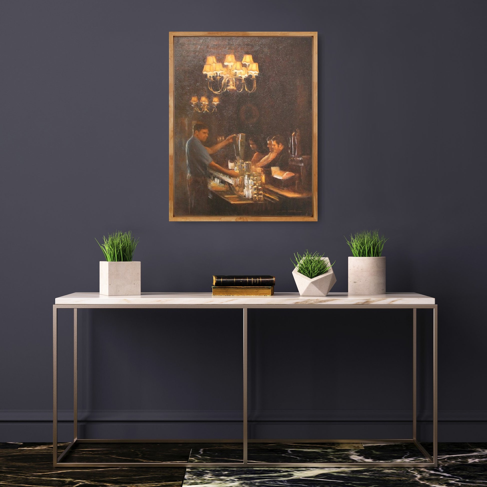 A slice of life painting depicting a cozy bar and its patrons. This painting is done in darker colors with pops of light from the chandeliers illuminating the patrons and bar. The painting captures a moment of quiet intimacy among the strangers, who share a drink and a conversation in the dimly lit space. The painting conveys a sense of warmth and comfort, despite the gloomy atmosphere. The painting is signed by the artist, Jeff Morrow, in the lower right corner.