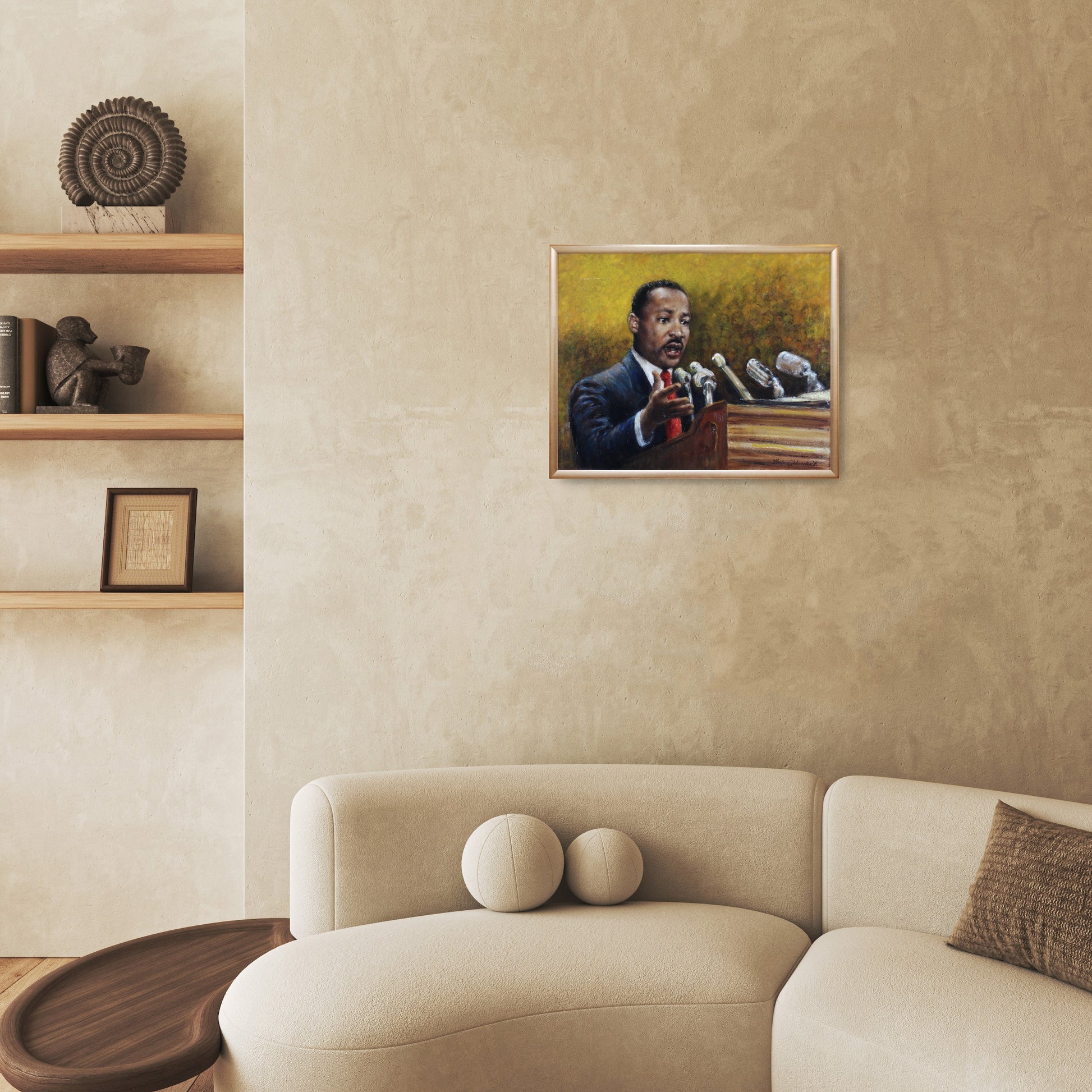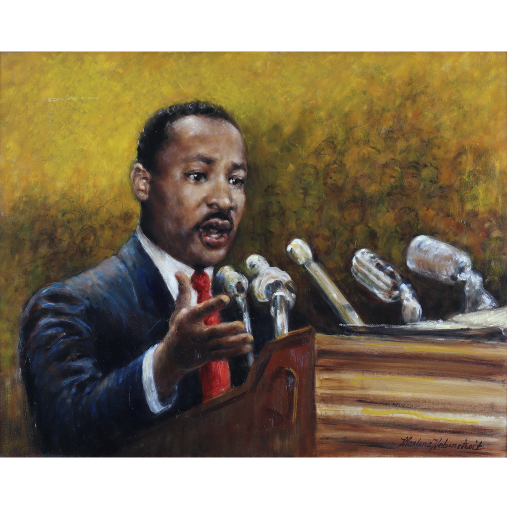Marlena's paintings capture the spirit of Martin Luther King Jr's legacy. In this one, she depicts him delivering his I Have a Dream Speech, a powerful vision of racial harmony. The artist's signature is visible in the bottom right corner.