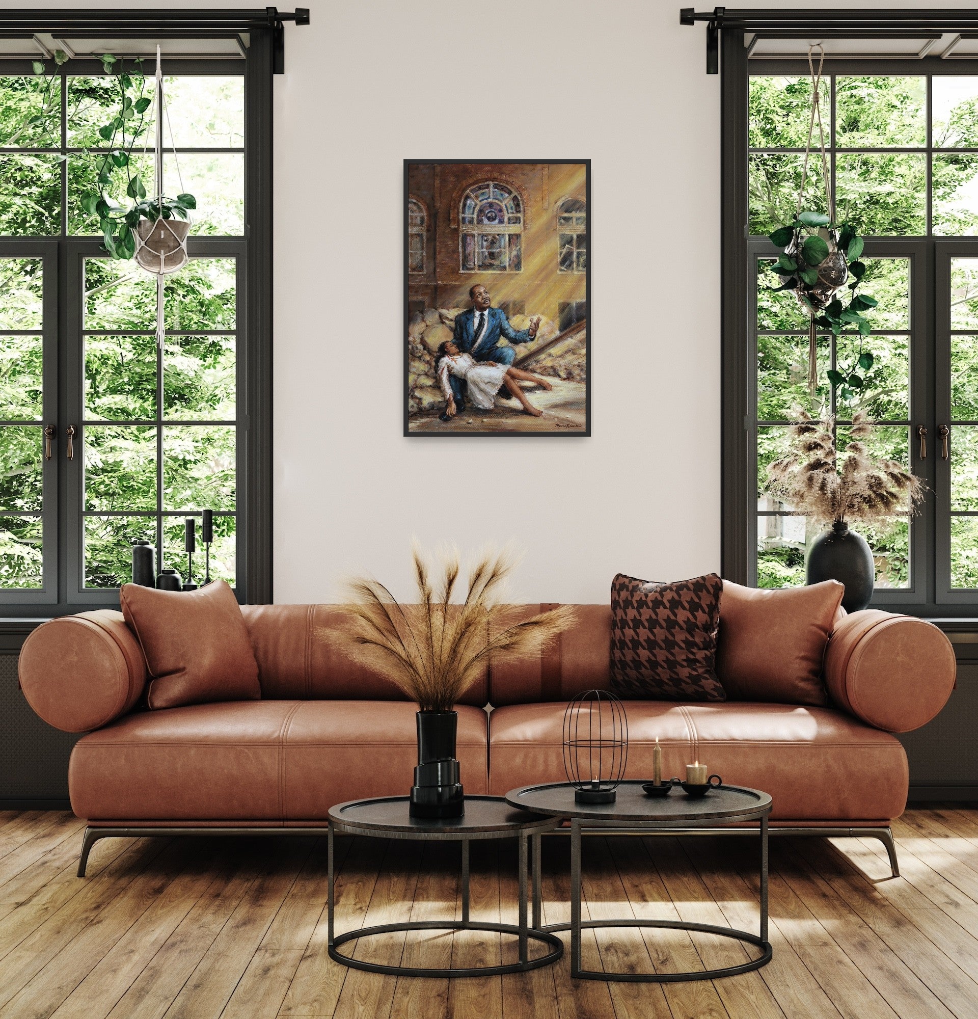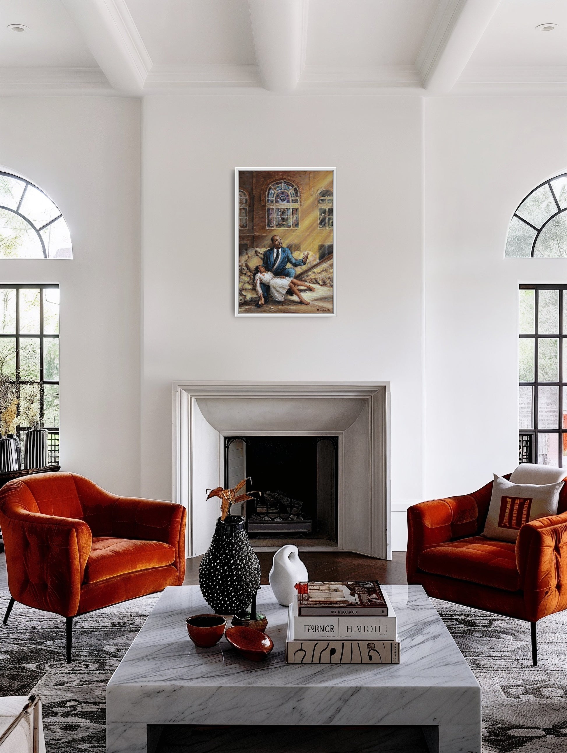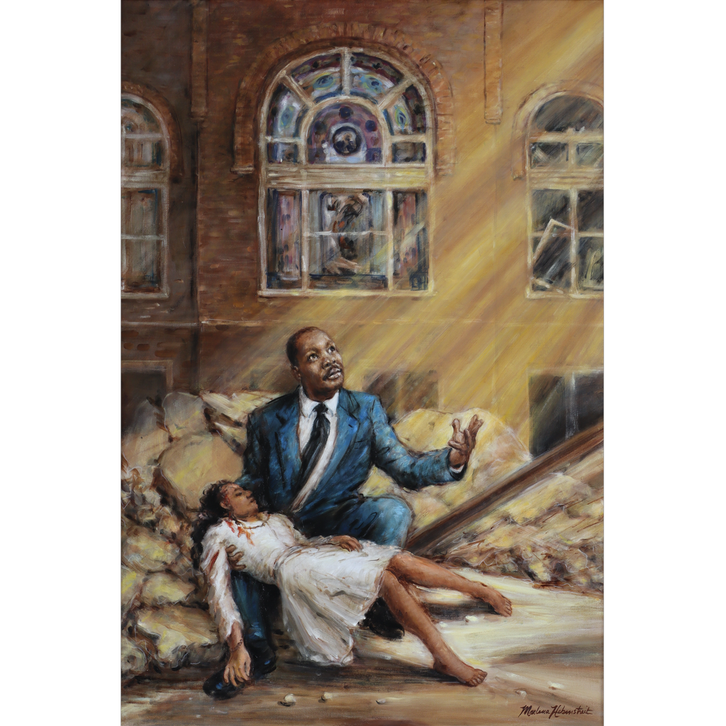 This painting is part of Marlena's series that honors the legacy of Martin Luther King Jr. It portrays a powerful scene of King embracing one of the young victims of the 1963 Birmingham church bombing, as a divine light shines upon them. The artist's signature is visible on the bottom right corner. This artwork is a moving tribute to King's compassion and courage in the face of violence and injustice. You can see this painting and others from the same series at the Art Enclave Gallery.
