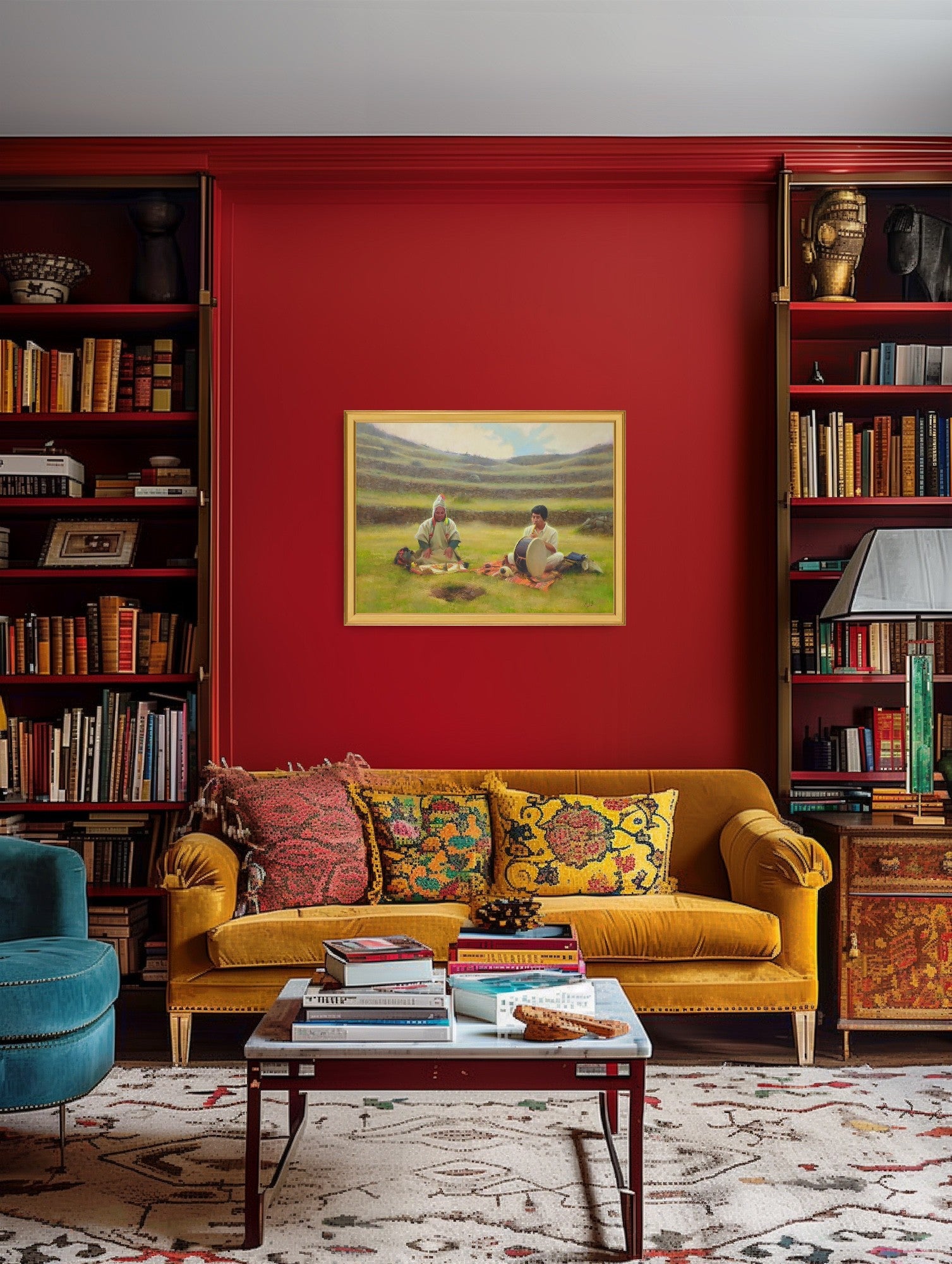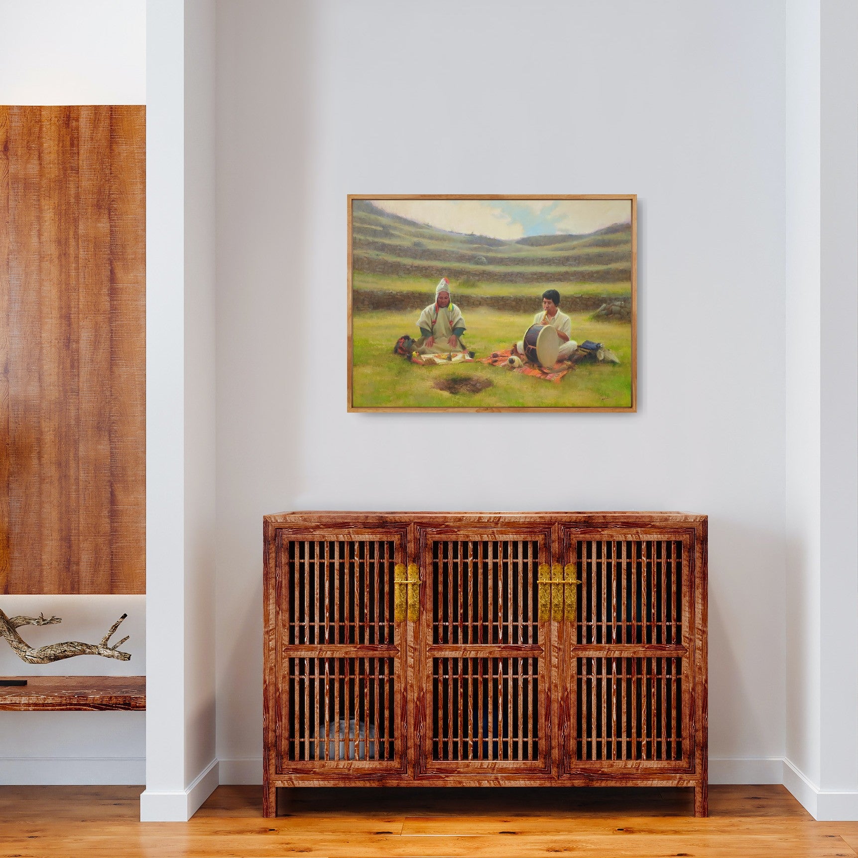 "Ancient Spirit" by Chuck Marshall is an enthralling painting that immerses viewers in a serene, culturally rich scene set amidst terraced landscapes. The artwork depicts two individuals deeply engaged in a traditional ritual or ceremony. The figure on the left is dressed in elaborate ceremonial attire, including a distinctive headdress adorned with vibrant feathers, and sits on the ground with hands placed on a cloth before them. The other figure, positioned on the right, plays a large drum, infusing the scene with a rhythmic musical element. Both individuals are seated on colorful, patterned textiles, adding to the cultural depth and visual appeal of the painting. The background showcases ancient stone terraces, suggesting a historical or archaeological significance, and evokes a profound sense of reverence and connection to ancient traditions.