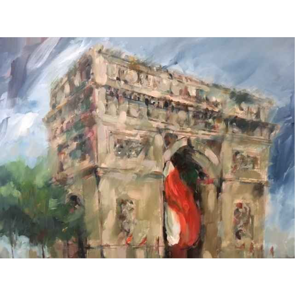 This artwork is an Impressionist rendition of the Arc De Triumph by Patrick Romelli. The artist zooms in on the details of the monument, creating a sense of awe and admiration. The color palette is dominated by beige and blue, with a striking red contrast in the center. The painting is signed by the artist's.