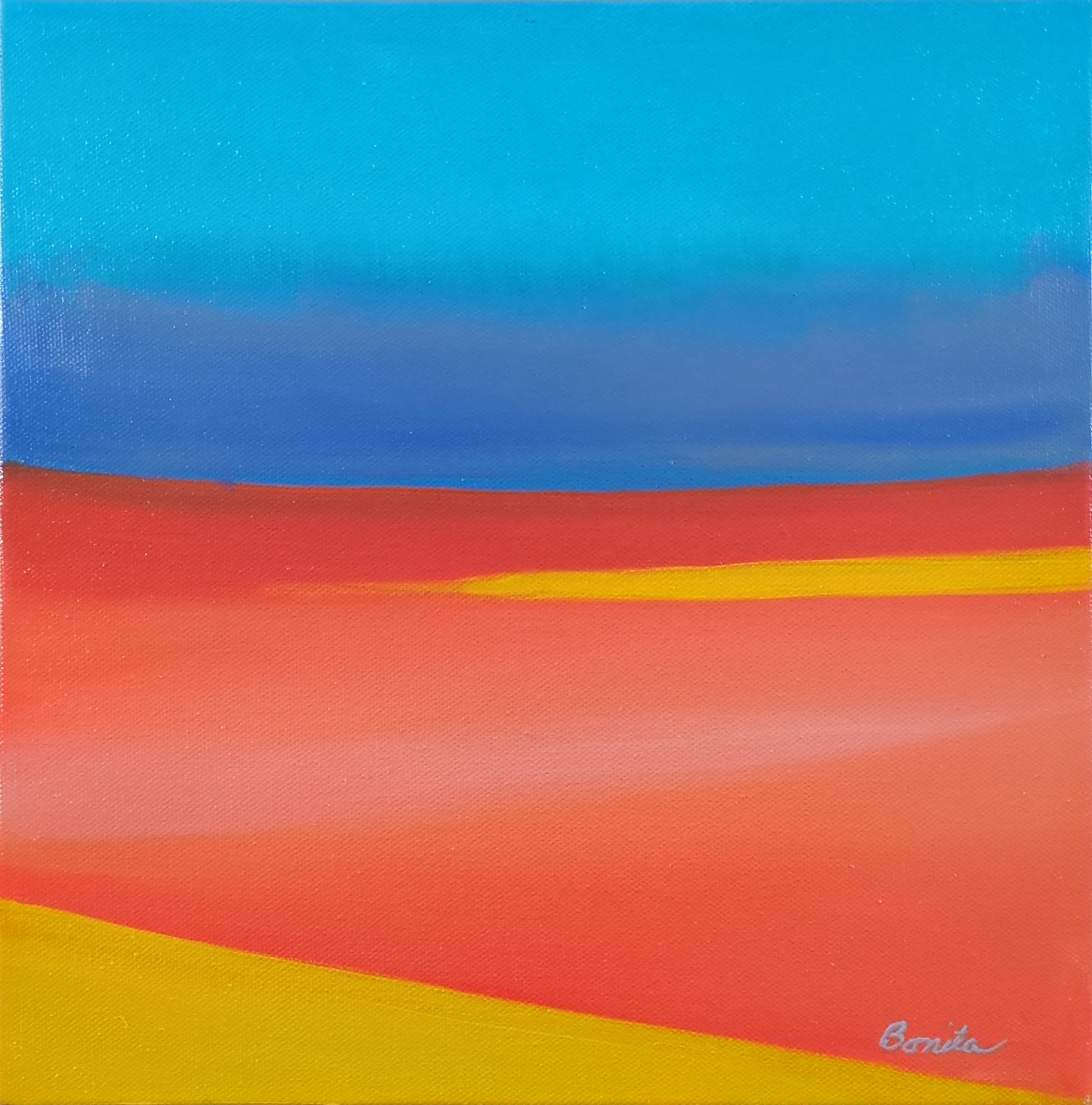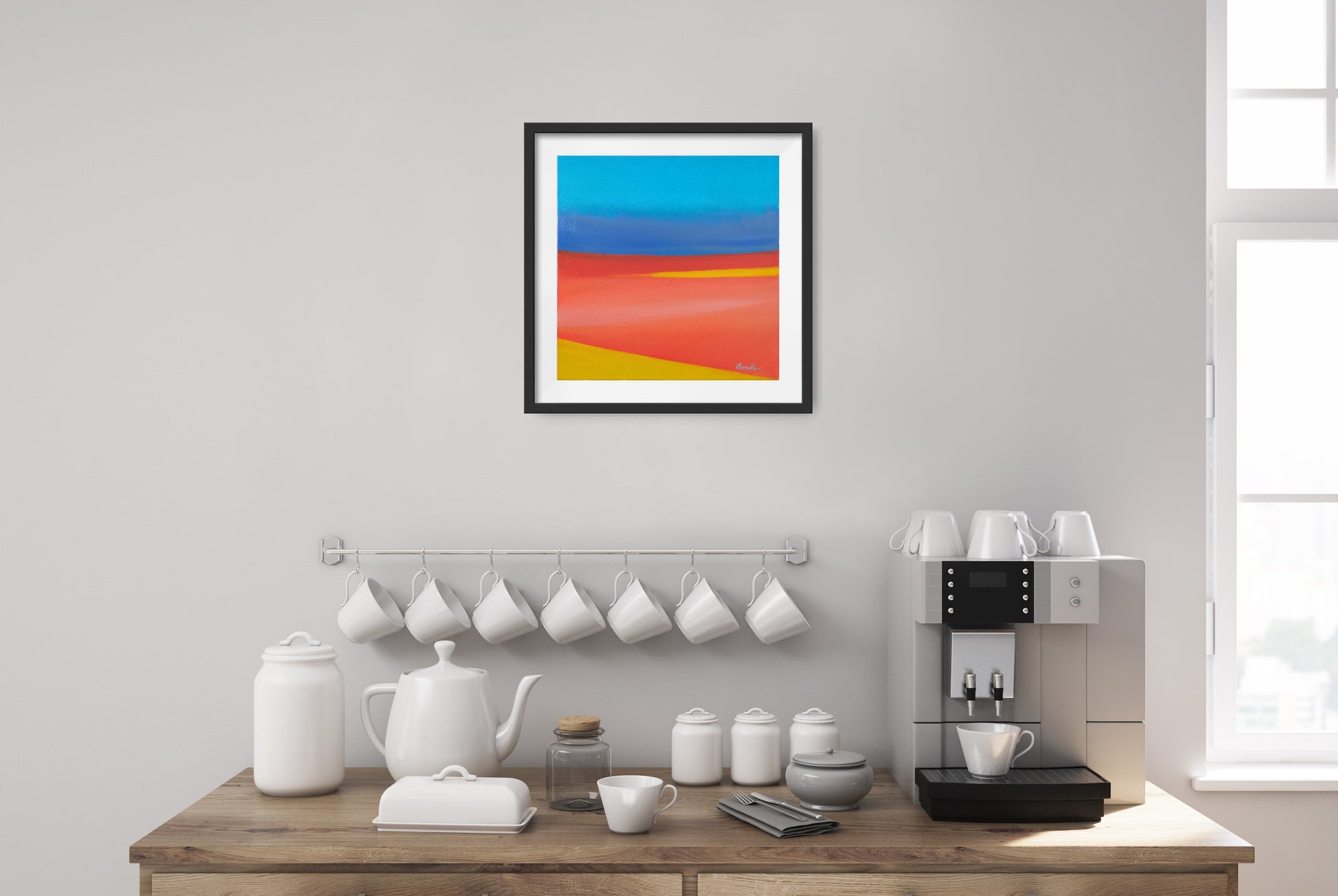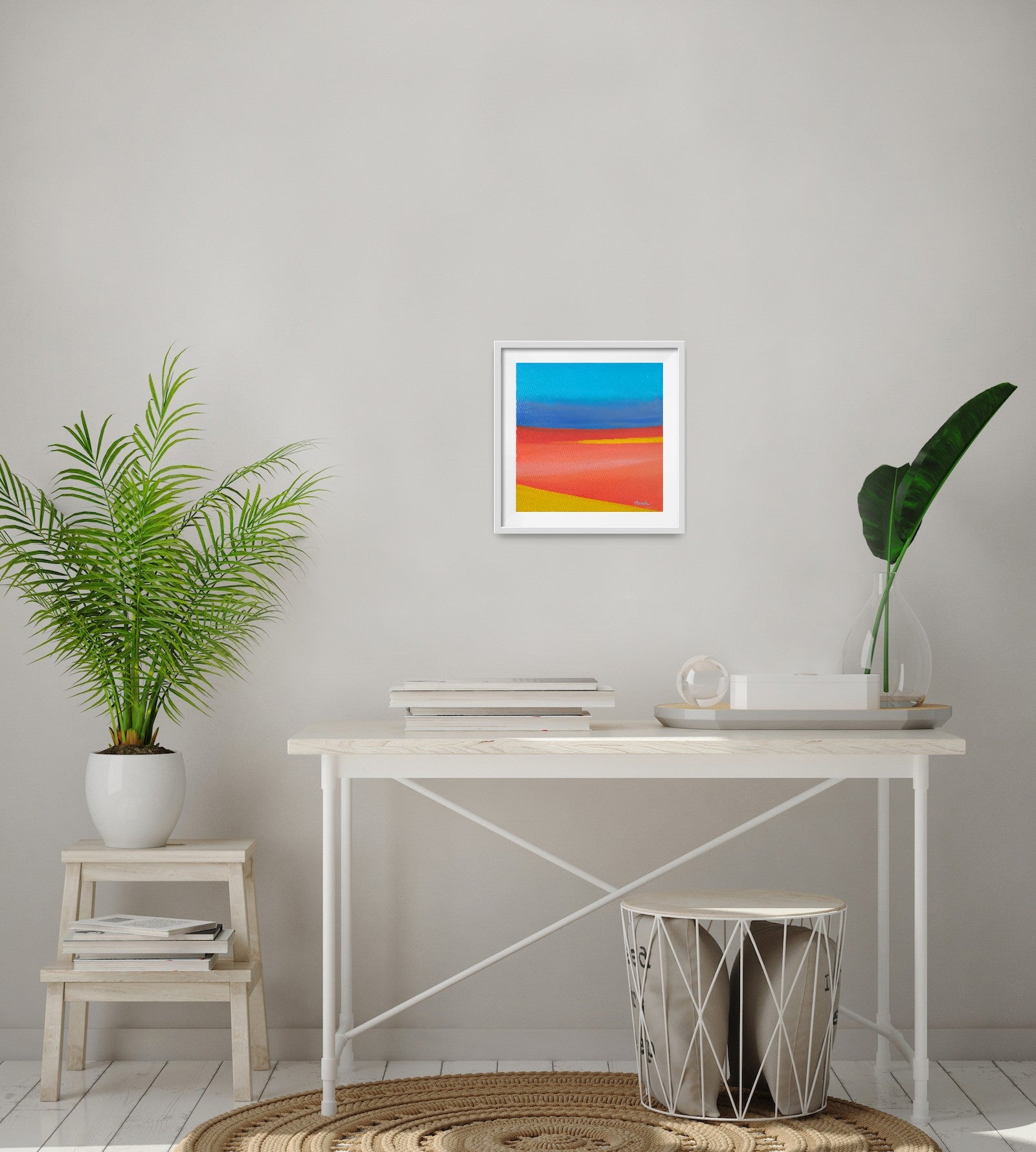 This abstract painting features a minimalist composition with a strong emphasis on color. The canvas is divided into horizontal bands of color, with a bright blue sky transitioning into a darker blue or gray band, followed by a dominant warm red or orange section, and finally accented with diagonal yellow stripes at the bottom corners. The colors are applied smoothly, creating a sense of depth and a tranquil, almost meditative quality. The overall effect is a serene and harmonious exploration of color and form.