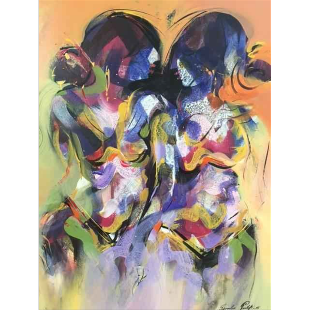 Best Friends by Bijendra Pratap is a vibrant and expressive gouache on paper abstract painting that depicts two women facing each other in a close and intimate pose. The background is a warm and sunny yellow and light green, contrasted by the cool and dark purples, greens, yellows, whites and blacks that outline the figures. The painting is signed by the artist. This painting is a unique and original artwork that captures the bond and friendship between two women. It is available for pick up only at Mason, Ohio.