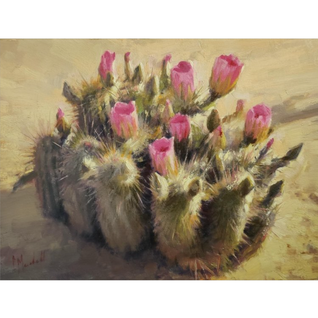 If you are looking for a piece of art that captures the beauty and resilience of nature, you might be interested in this small oil painting by Chuck Marshall. The painting depicts a cactus in the southwest, with delicate pink flowers emerging from its spiny surface. The artist uses realistic colors and details to create a contrast between the harsh desert environment and the soft floral touch. The painting is signed by the artist.