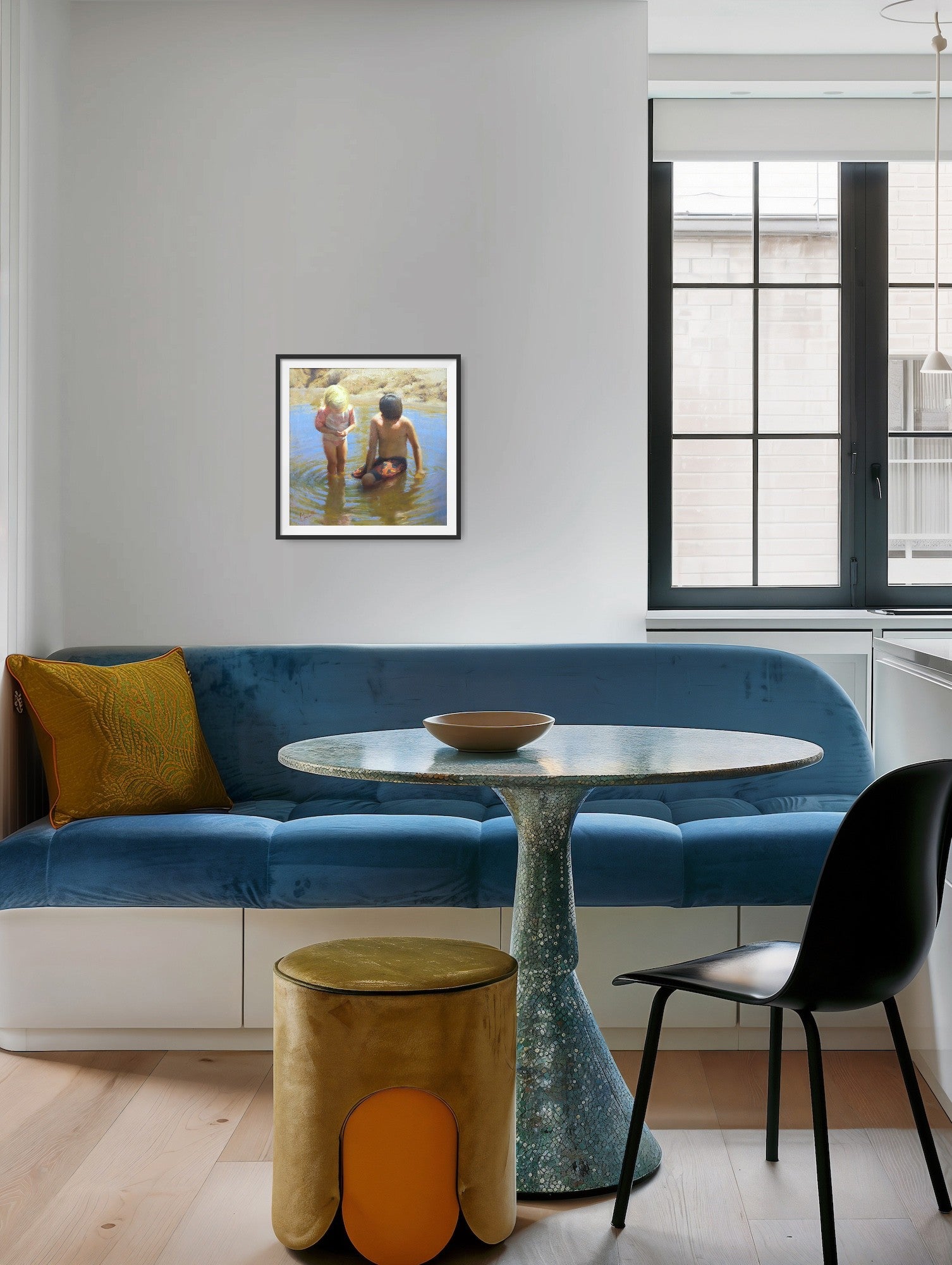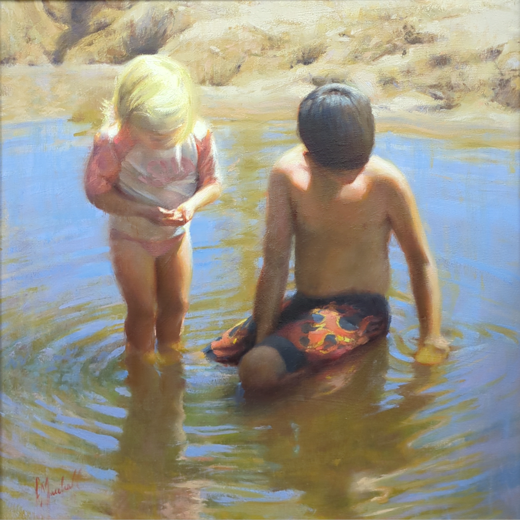 "Childhood Reflections" by Chuck Marshall: A Poignant Tribute to the Innocence of Youth is a captivating painting that beautifully captures the innocence and wonder of childhood. The artwork depicts two children, a young girl and a boy, playing in a shallow body of water. The girl, with her blonde hair illuminated by the sunlight, is standing and intently examining something in her hands, dressed in a light pink outfit. The boy, with darker hair, is sitting in the water, wearing colorful swim trunks. The serene water reflects their figures, creating a sense of tranquility and nostalgia. The background features a sandy, rocky shore bathed in warm sunlight, enhancing the overall warmth and peacefulness of the scene. This painting is a poignant reminder of the simple joys and explorations of childhood, making it a timeless piece for any art collection.