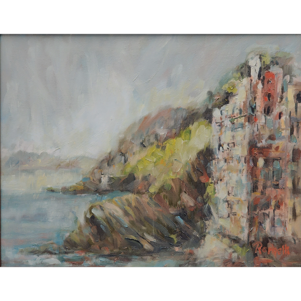Patrick Romelli captures the beauty and drama of the Cinque Terre region in this Impressionist style painting. Using bold brush strokes and contrast, he creates a sense of depth and movement in the landscape. The high cliffs of Cinque Terre descend to the turquoise water, creating a striking contrast between land and sea. The painting evokes the atmosphere and charm of this picturesque Italian destination. This painting is signed by the artist.