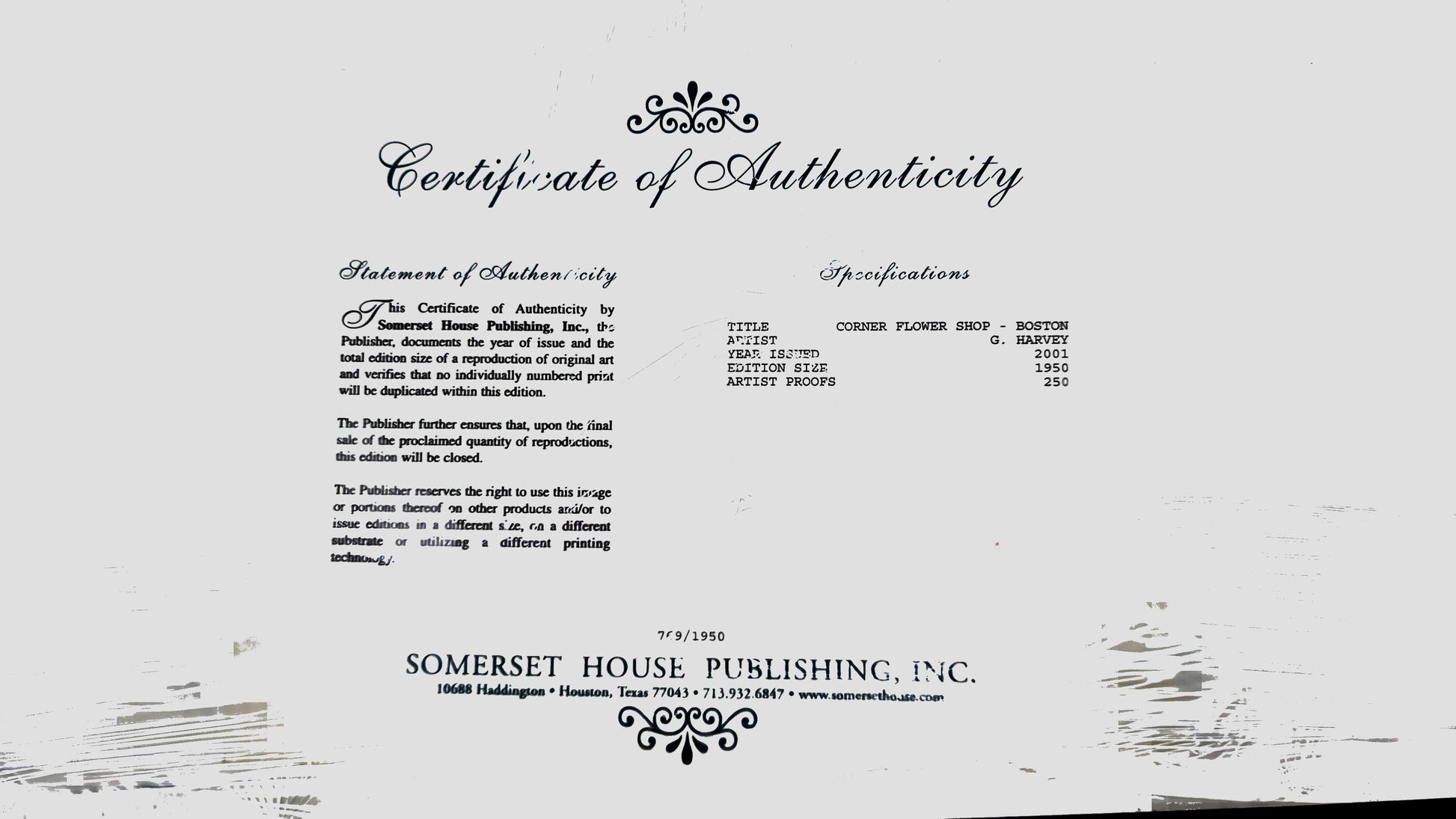G. Harvey's Corner Flower Shop depicts a vibrant street scene of old Boston, full of texture and life. The detailed painting captures the beauty and spirit of a bygone era, perfect for adding a timeless touch to any home or office.