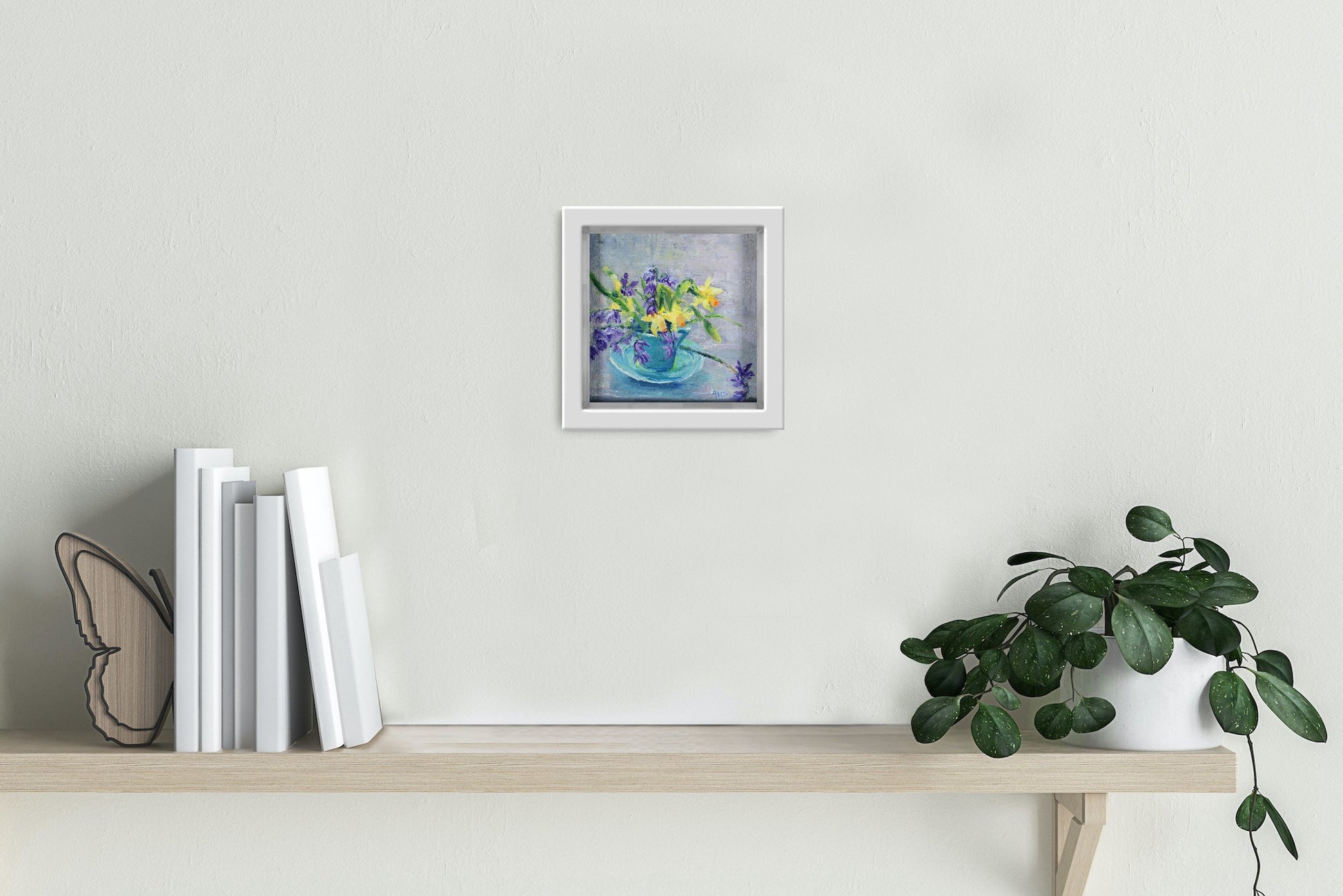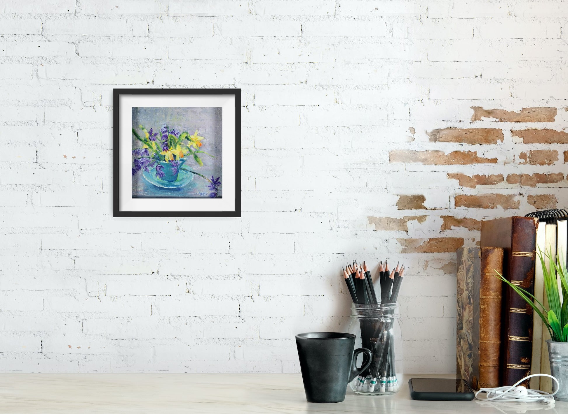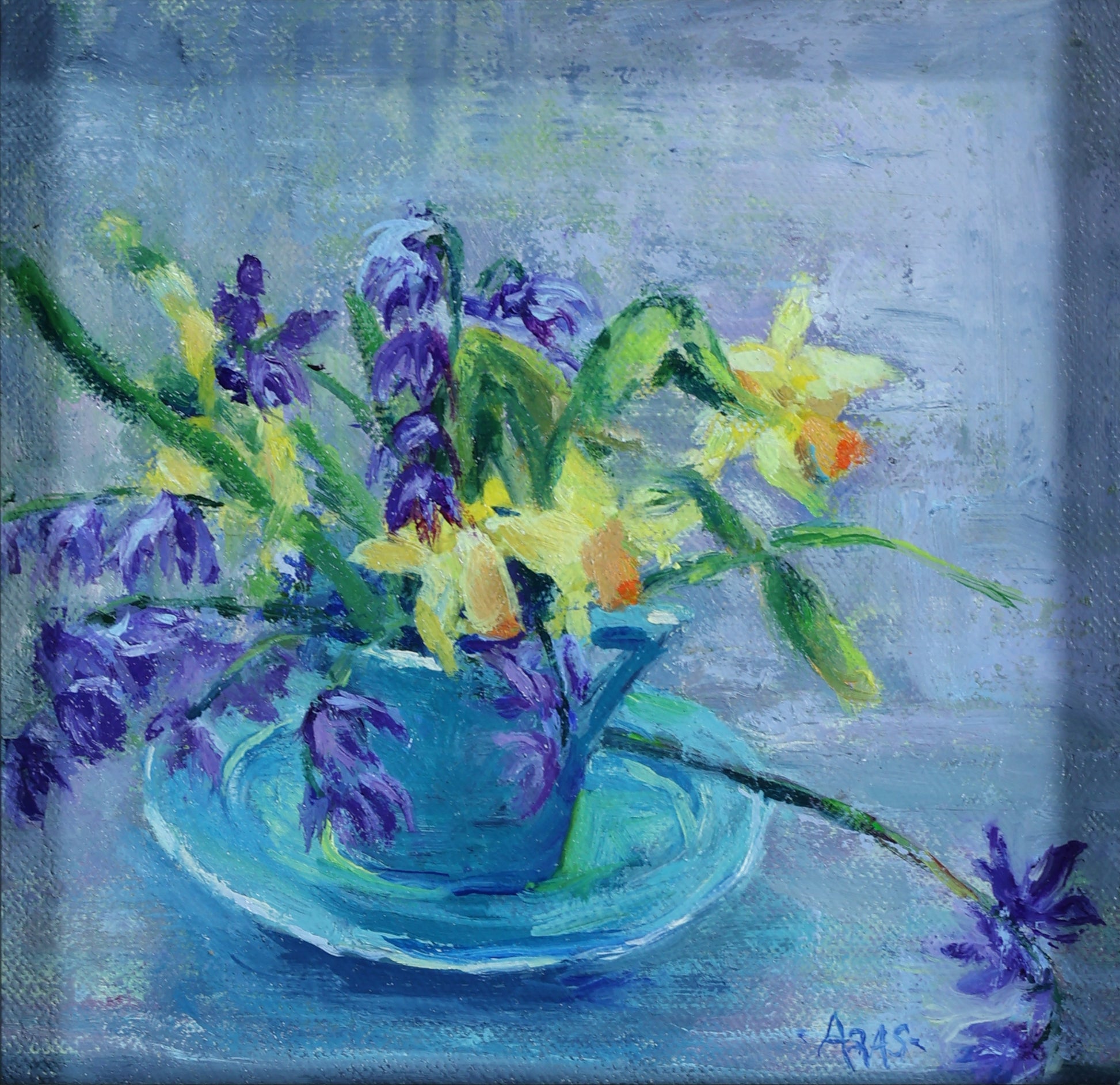 This vibrant still life painting features a delicate arrangement of yellow daffodils and purple wildflowers in a translucent blue teacup, set against a soft, muted background. The artist's expressive brushstrokes and dynamic use of color create a sense of movement, as the flowers seem to spill gracefully beyond the cup. The interplay of warm yellows and cool blues adds depth and harmony, while the loose, impressionistic style captures the fleeting beauty of fresh blooms. The overall effect is lively and refreshing, evoking a sense of springtime energy and delicate elegance.