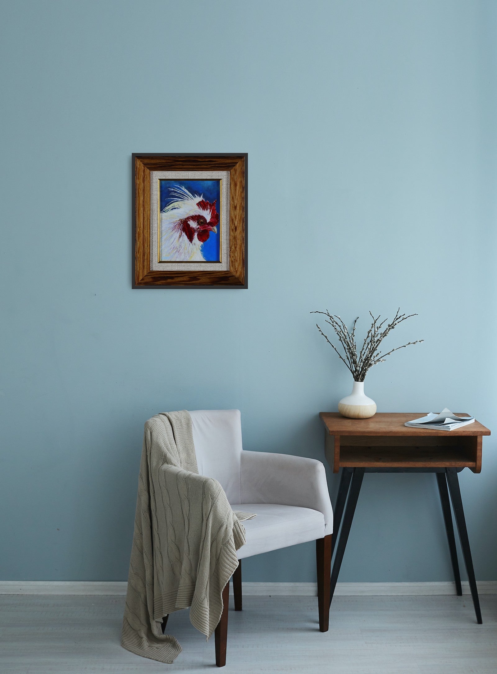 Sharon East's painting presents a close-up portrait of a rooster, rendered with vibrant colors and a focus on the bird's unique features. The rooster, depicted with white feathers and a striking red comb and wattles, fills the frame, its head turned slightly to the side. The white feathers are rendered with detailed brushstrokes, creating a sense of texture and volume. The red comb and wattles, rendered with bold strokes and vibrant hues, add a focal point to the composition. The rooster's eye, rendered with a dark pupil and a hint of reflection, adds a sense of life and realism. The background, rendered with a solid blue hue, provides a strong contrast, highlighting the rooster's form and color. The light source, coming from the upper left, illuminates the rooster and casts subtle shadows, adding a sense of depth and realism. East's use of color and detail captures the unique beauty and character of the rooster.