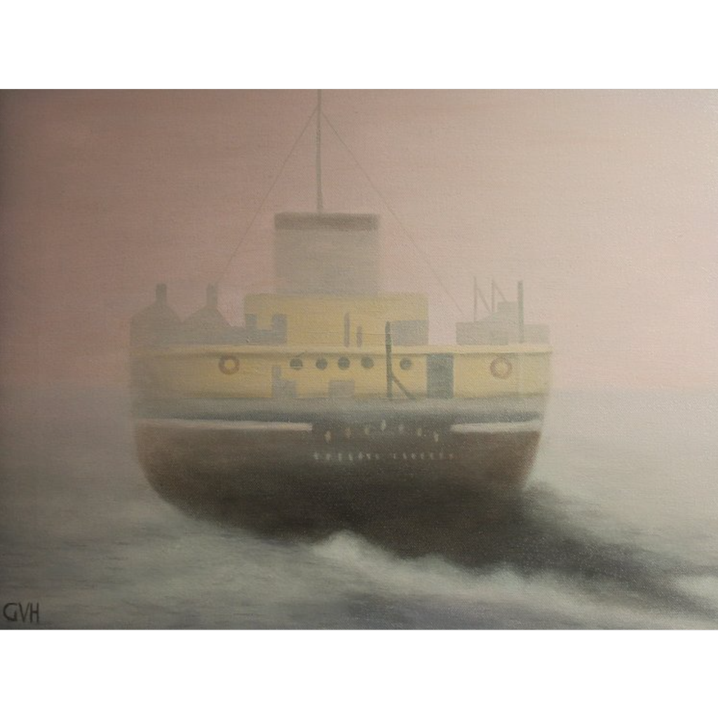 In this painting, the artist Grant V Hesser captures a mysterious scene of a boat vanishing into the misty horizon. The boat has a geometric shape that contrasts with the softness of the fog, creating a sense of tension and intrigue. The color palette of pink and gray evokes a feeling of nostalgia and melancholy. The artist has signed this painting with a distinctive signature, indicating their personal style and vision. This is a unique and captivating artwork that would appeal to fans of Art Deco and maritime themes.