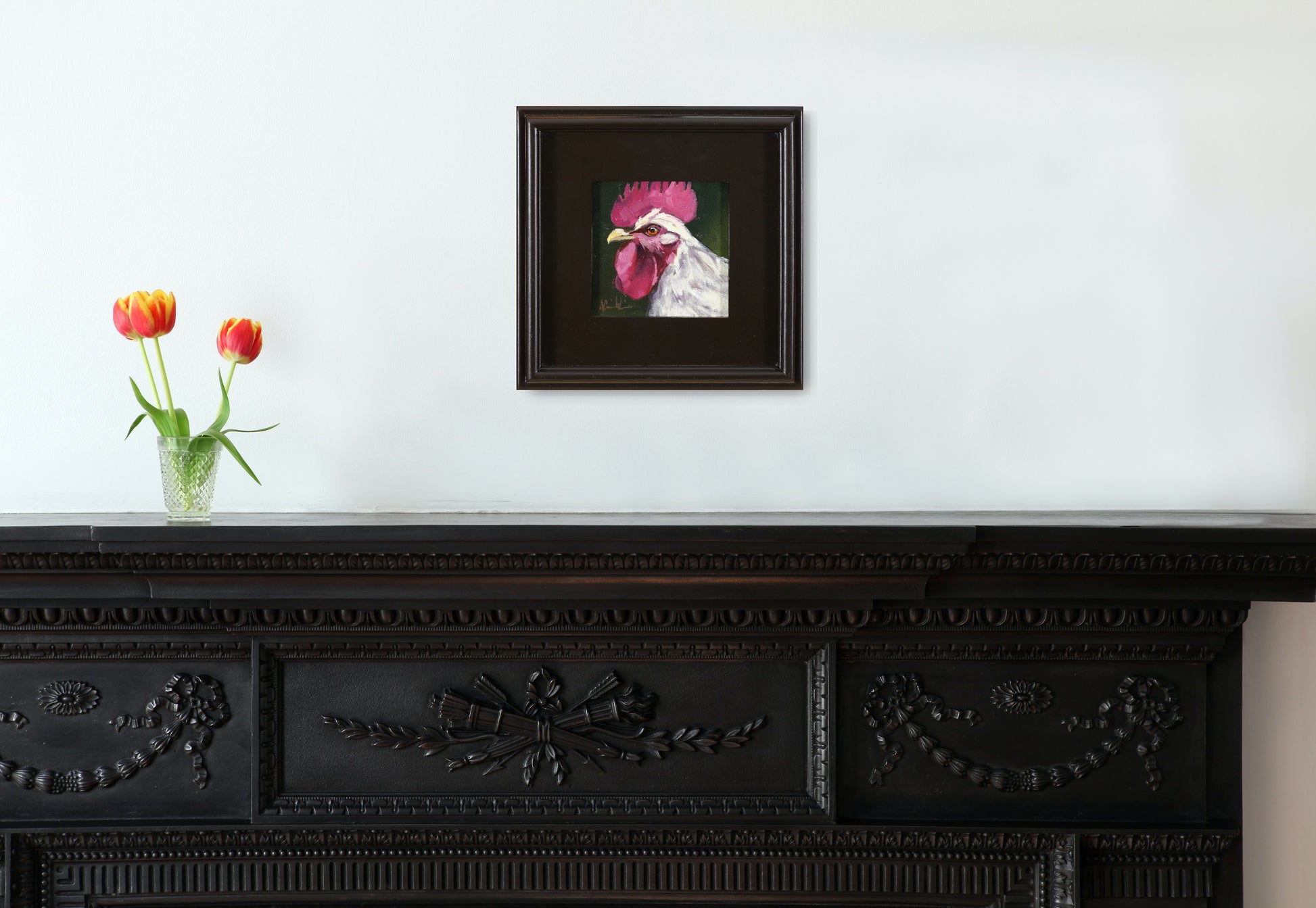 Ann Grimaldi's painting is a close-up portrait of a white rooster's head. The rooster has a prominent, bright red comb and wattles, a sharp yellow beak, and a visible orange eye. Its white feathers are rendered with textured brushstrokes. The background is a dark, muted green. Grimaldi's focus is on the rooster's distinct features and vibrant colors against the dark backdrop.