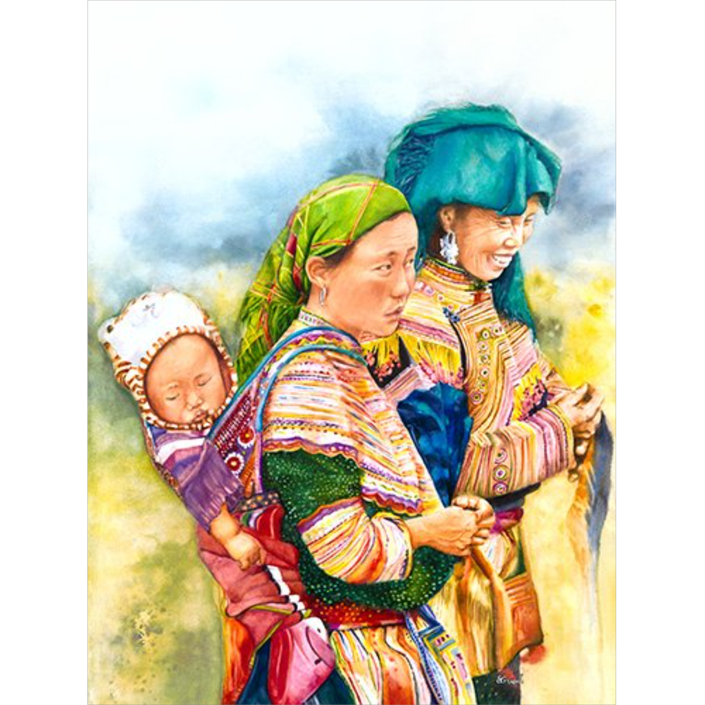 This watercolor painting by Sylvie Griselle depicts a charming scene of 2 women and a baby dressed in vibrant Asian attire. The artist skillfully captures the expressions and gestures of the subjects, as well as the rich textures and patterns of their clothing. This exquisite piece of art is signed by the artist.