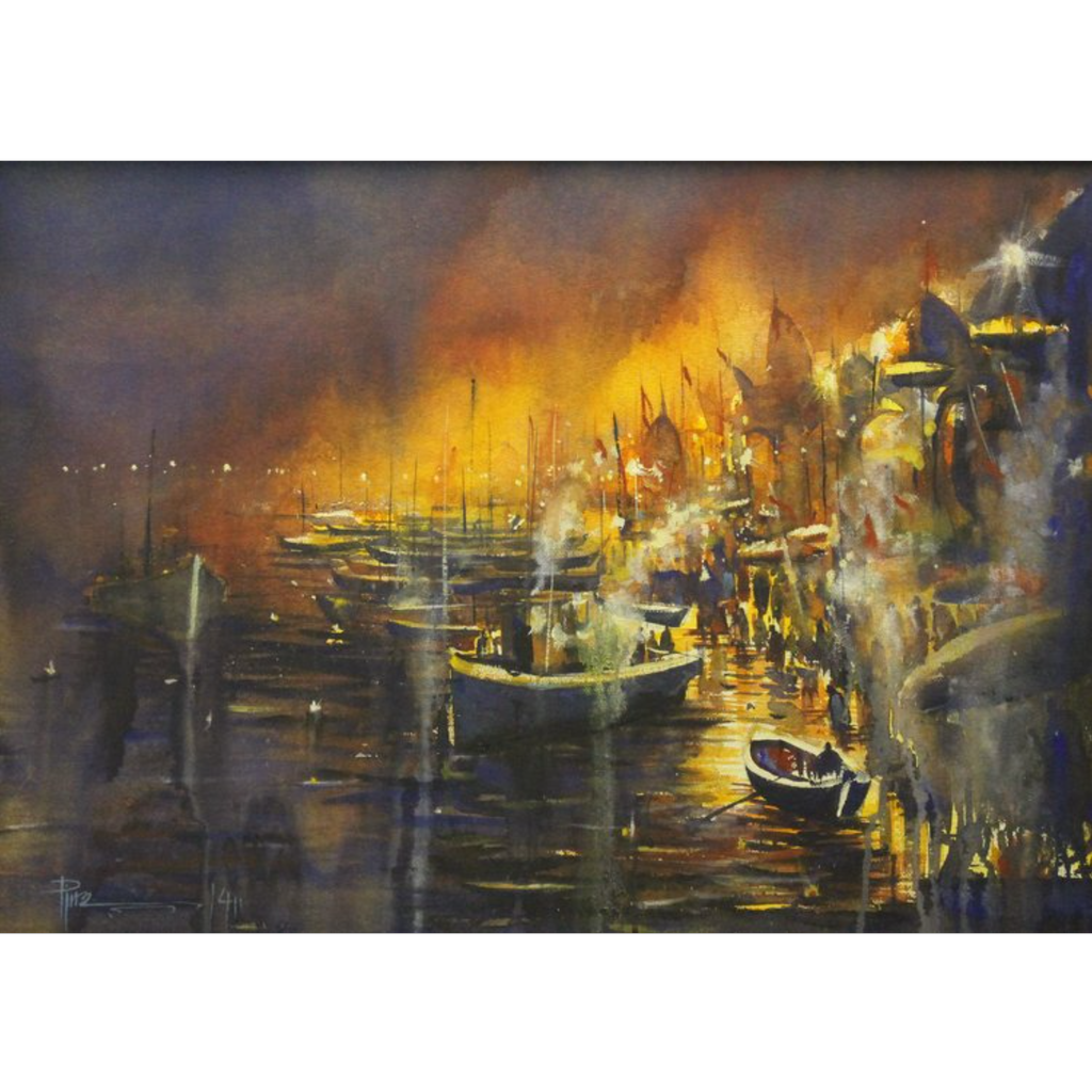 Pintu Sengupta's watercolor painting captures the lively atmosphere of an Indian harbor at night. The artist uses a rich palette of yellows and golds to contrast the dark sky and water, creating a stunning effect of light and shadow. The painting shows the details of the boats, buildings, and people in the harbor, inviting the viewer to imagine the stories and sounds of the city. The painting is signed by the artist in the lower left corner.