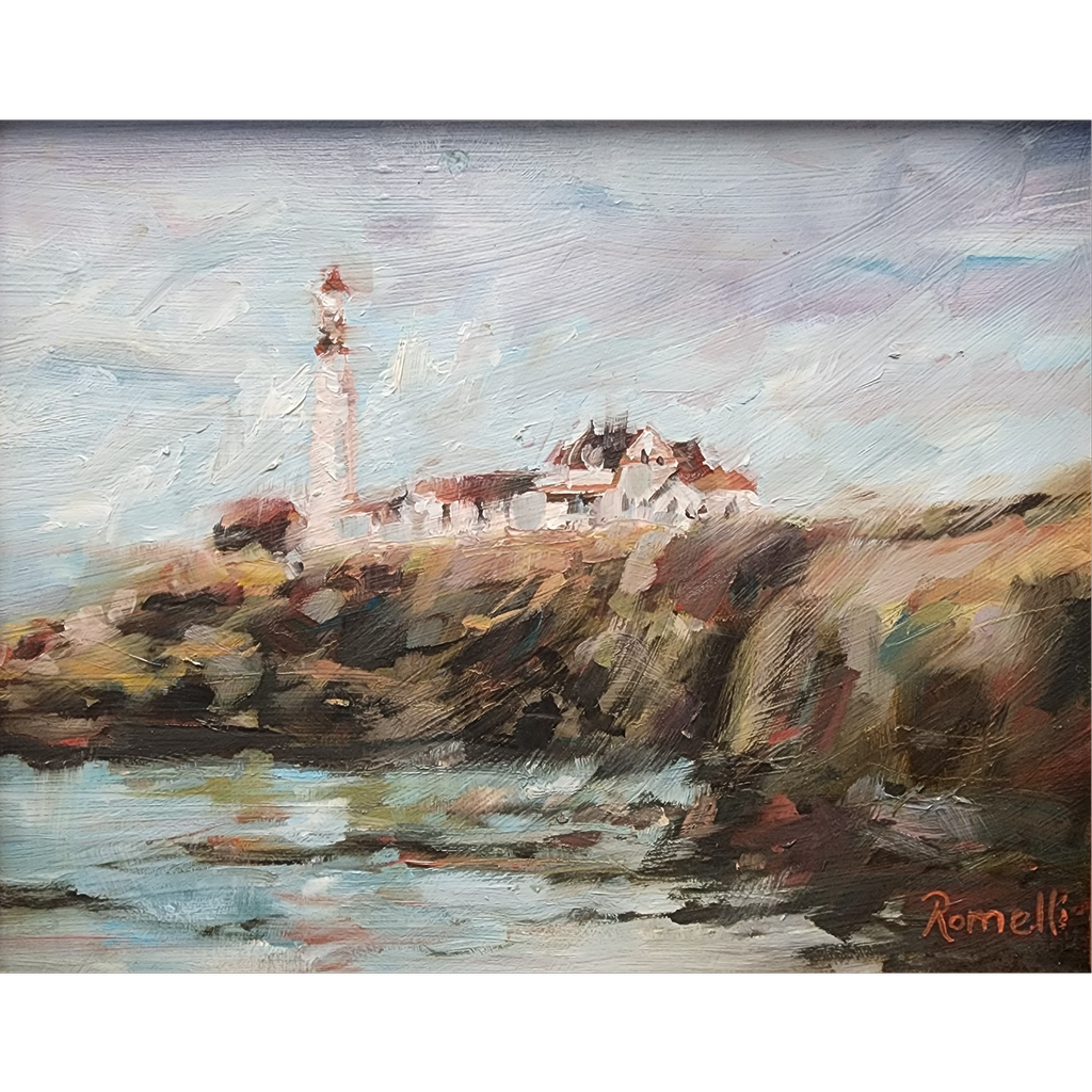 Patrick Romelli captures the beauty and tranquility of the Portland Head Lighthouse Maine in his impressionist painting Lighthouse and Shore. Using soft brushstrokes and a muted palette, he creates a serene scene of the lighthouse standing tall against the sky and the sea. The painting evokes a sense of nostalgia and admiration for the historic landmark that has guided sailors for over two centuries. Romelli's painting is a perfect choice for anyone who loves impressionism, lighthouses, or the Maine coast.