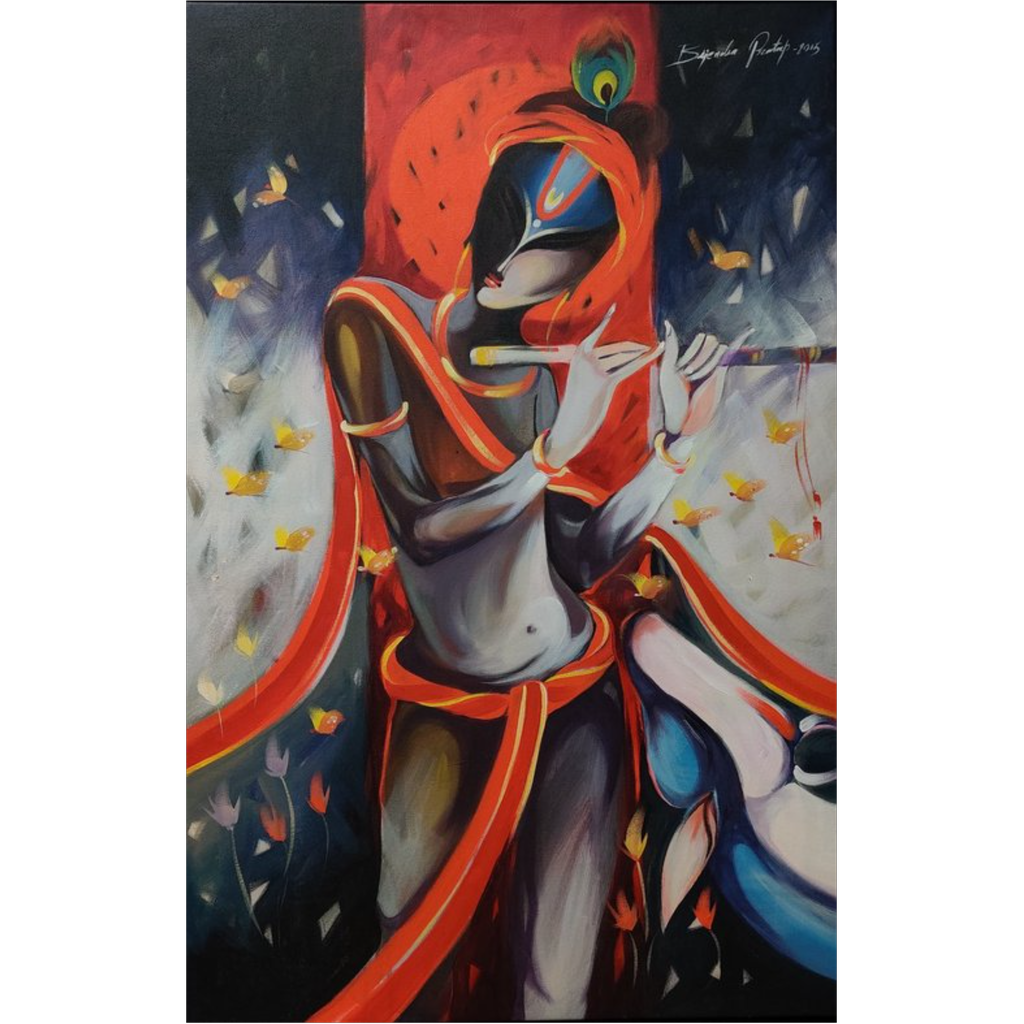 Bijendra Pratap's painting is a vibrant and modern rendition of Lord Krishna, the Hindu deity of love and music. He uses a palette of bright colors to create a contrast between the divine figure and the mundane background. Lord Krishna is shown playing a flute for a sacred cow, a symbol of his compassion and generosity. The painting also features stylized butterflies and flowers, representing the beauty and joy of his divine presence. The artist's signature is visible at the upper right corner of the painting.