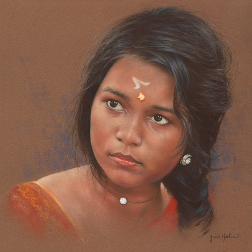 Mohana’s Eyes by Gisele Hurtaud is a stunning pastel portrait of a young Indian girl with expressive eyes and long black hair. The artist uses a dark brown/gold background to contrast the vibrant colors of the girl’s skin, hair, and clothing. The painting is based on a photograph by Michelle Briere and is signed by Gisele Hurtaud, a talented painter who specializes in realistic portraits. This artwork is available for purchase at Art Enclave, an online platform that showcases original and diverse artworks from around the world.