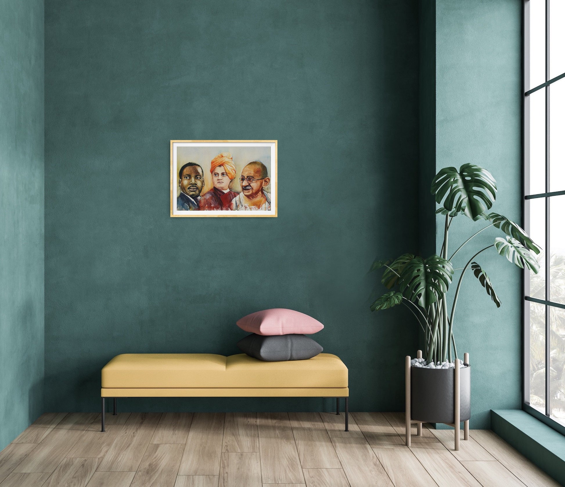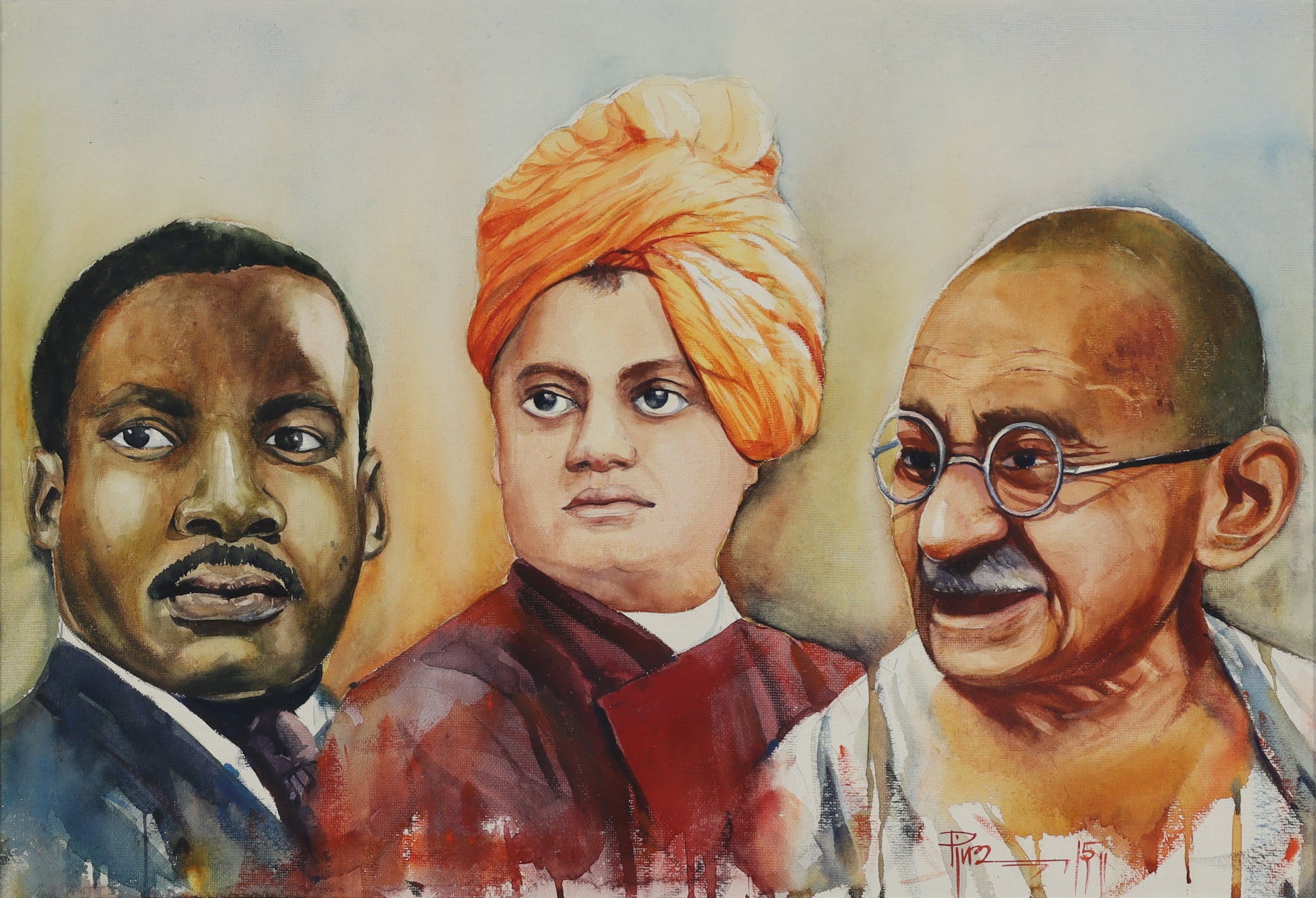 This watercolor painting beautifully captures three iconic historical figures: Dr. Martin Luther King Jr., Swami Vivekananda, and Mahatma Gandhi, each known for their profound contributions to peace, civil rights, and spirituality. The artwork features a rich color palette, soft blending, and a subtle gradient background, enhancing the depth and vibrancy of their expressions. The realistic yet expressive style highlights their noble and determined spirits, making this piece a powerful tribute to their legacies.