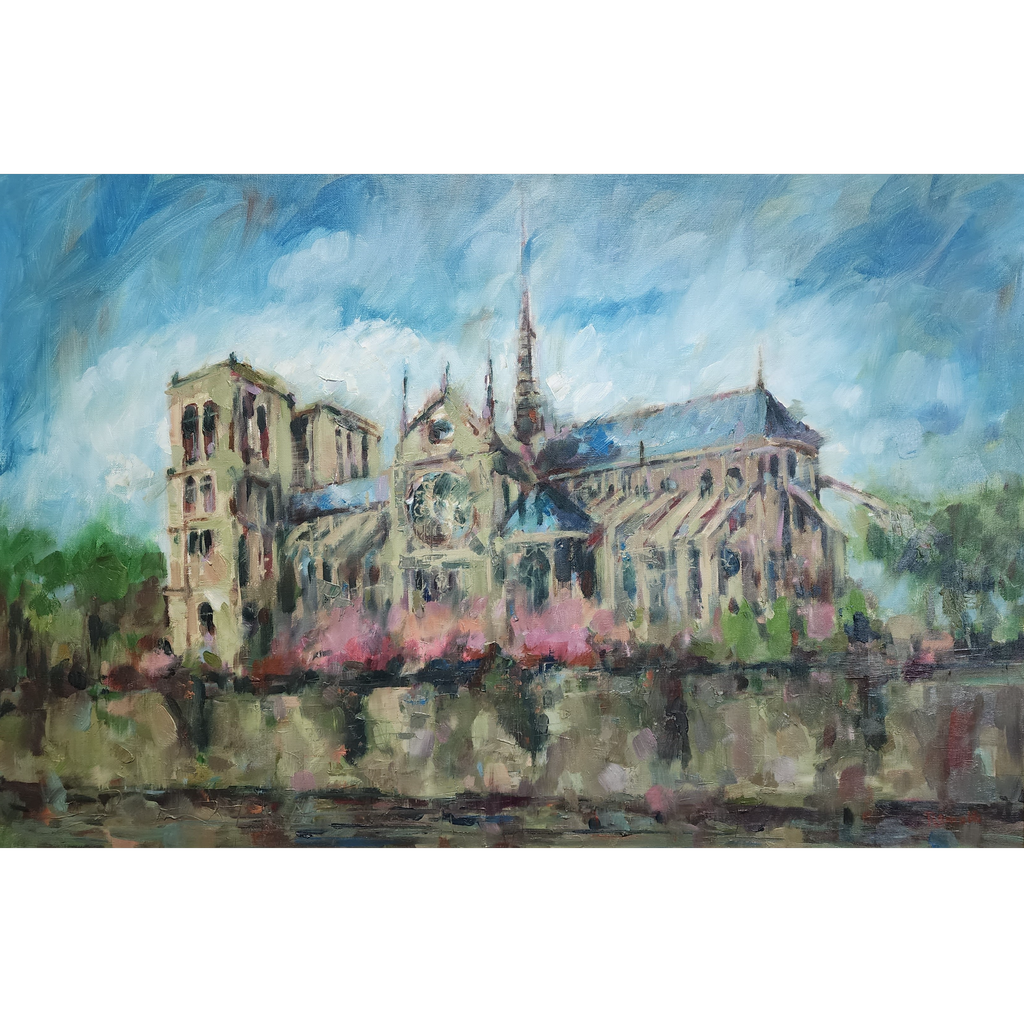 "Notre Dame" is an oil painting by Patrick Romelli. It depicts the Notre Dame cathedral in Paris, France. The painting is done in a loose, impressionistic style with a focus on the cathedral's architecture and the surrounding landscape. The colors are soft and muted, creating a peaceful and serene mood. The painting invites the viewer to appreciate the beauty and history of this cultural landmark, as well as the artist's personal vision and interpretation.