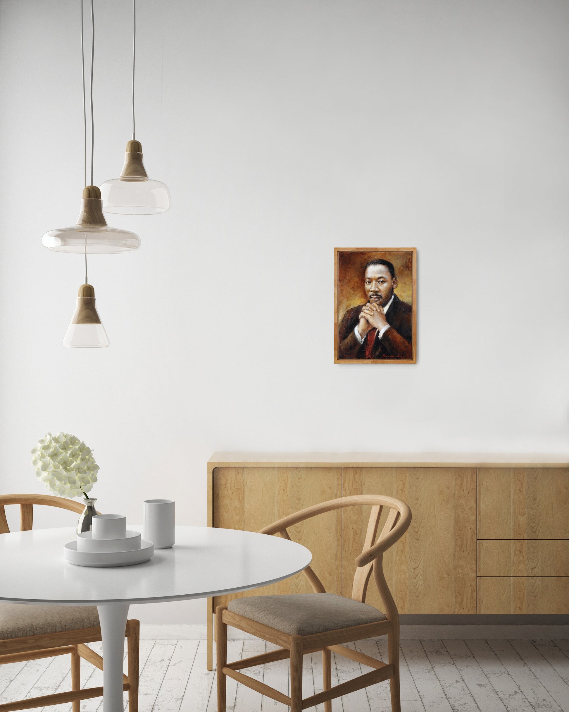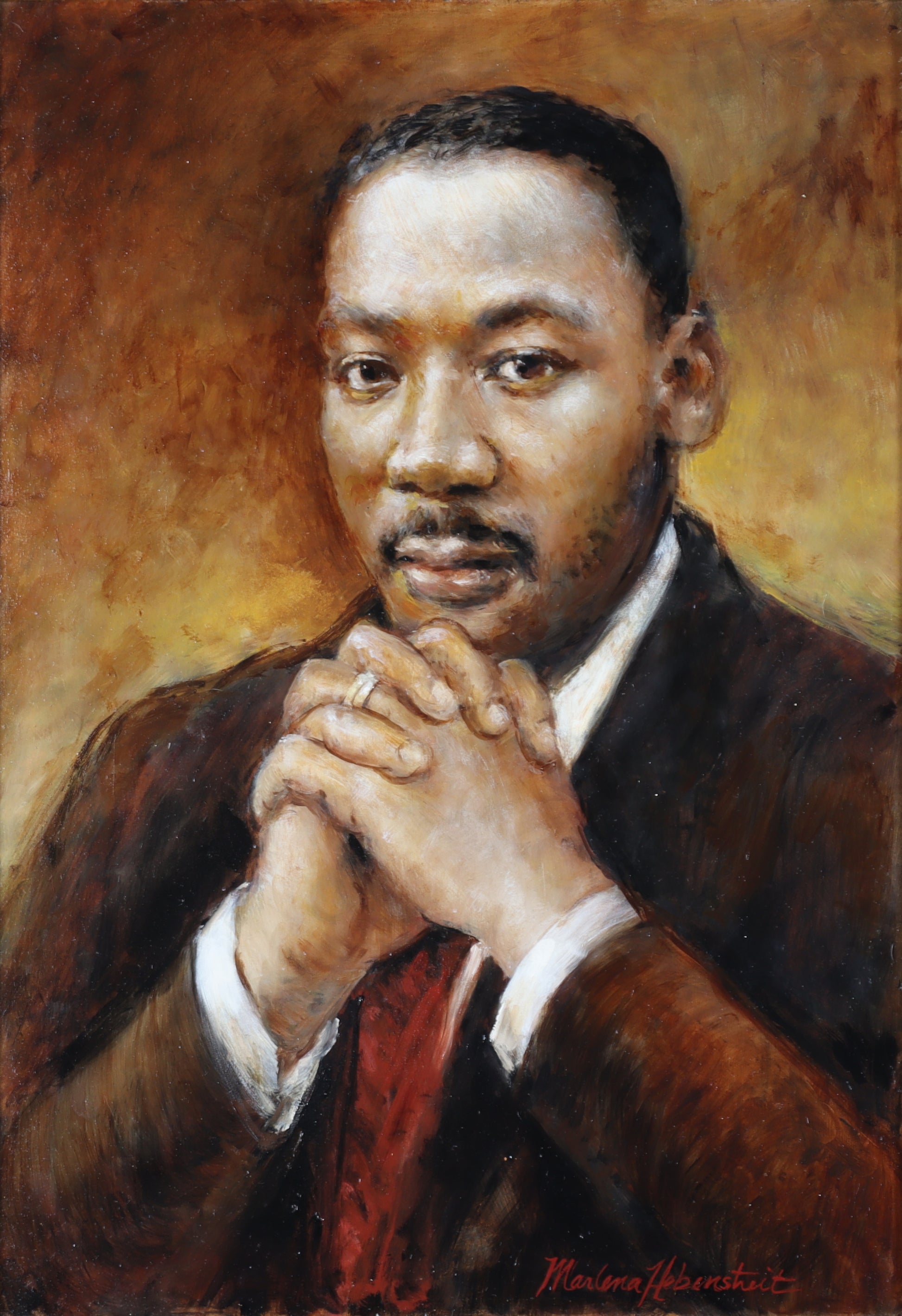 This painting is a striking portrait of Dr. Martin Luther King Jr., created in a realistic style with warm, earthy tones. His expression is calm yet determined, reflecting his wisdom and strength. The artist, Marlena Hebenstreit, has captured intricate details in Dr. King's facial features, hands, and clothing, bringing a lifelike quality to the piece. His hands are clasped in a contemplative pose, adding a sense of depth and introspection. The soft, blended brushstrokes and warm background hues create a sense of reverence and admiration, making this artwork a powerful tribute to his legacy.