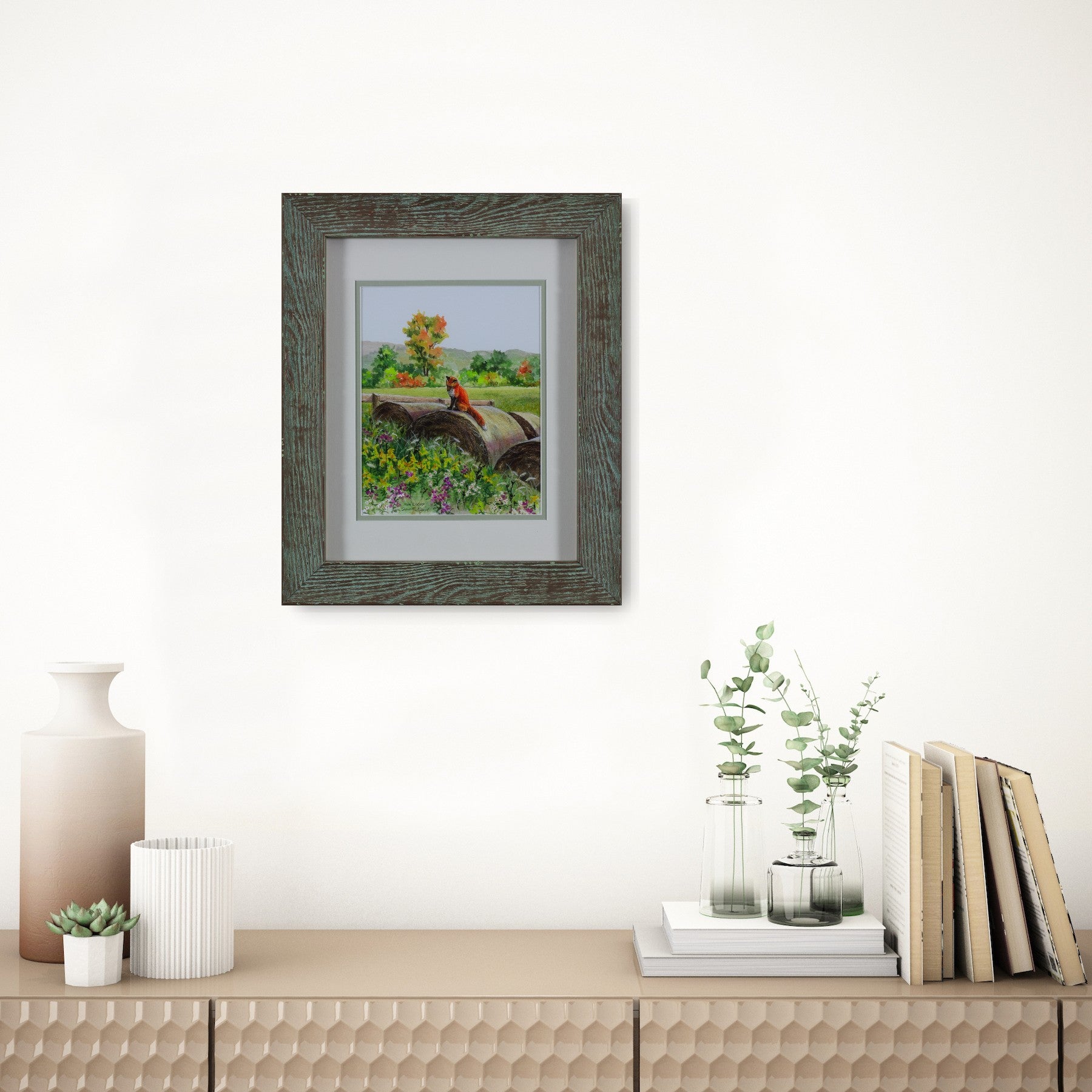 Ann Geise's painting depicts a fox sitting atop several round hay bales in a field. The fox is reddish-orange with a bushy tail and is looking to the left. The hay bales are brown and arranged in a row. In the foreground, there is colorful vegetation with yellow, purple, and white flowers. The background shows a green field with a wooden fence, various trees in shades of green and autumn colors, and a light blue sky. Geise's style captures a peaceful moment in a rural landscape.
