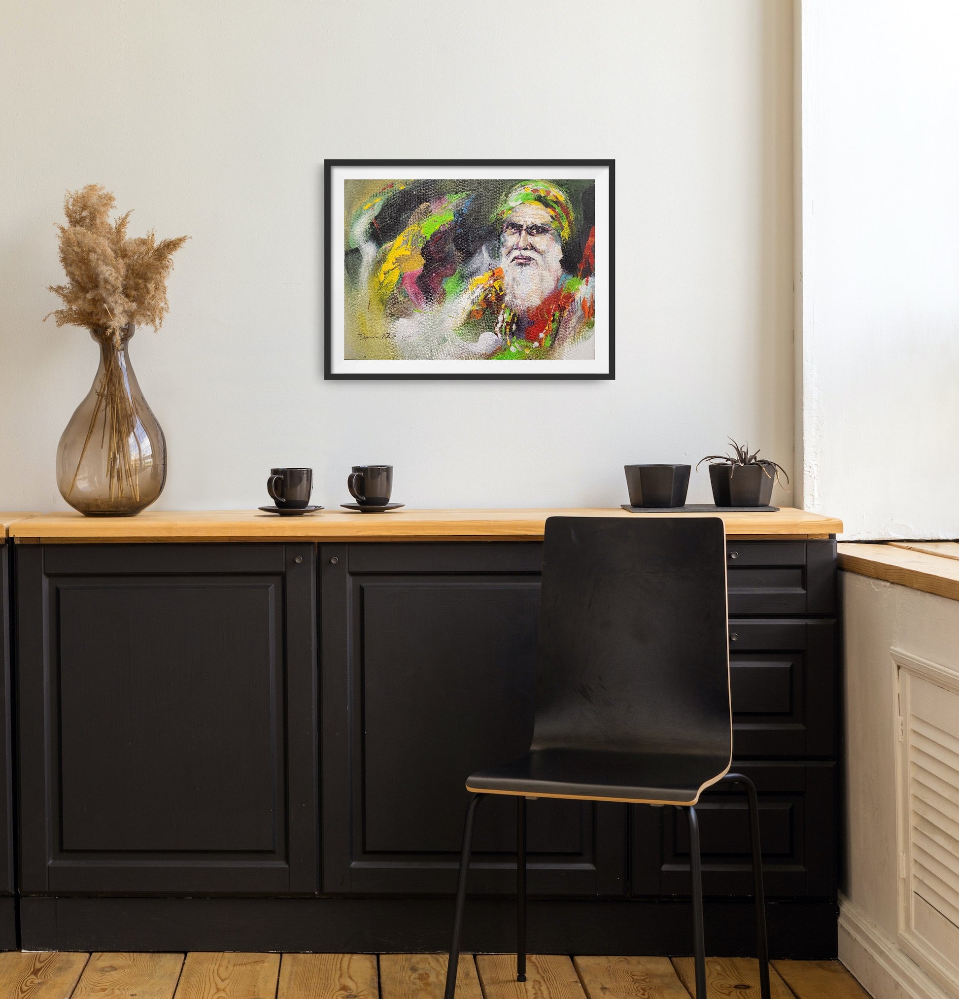 This is a portrait of a sadhu, a Hindu ascetic or holy person. The painting shows the sadhu’s face and upper body, with a white beard, a green head dress and several necklaces. The painting is made by Bijendra Pratap, an Indian artist who specializes in watercolor and acrylic paintings.