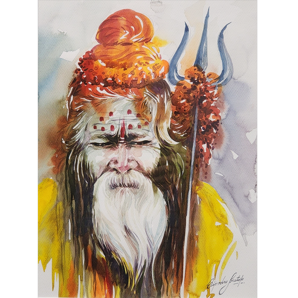 Sadhu with Trident is a stunning example of contemporary watercolor art by artist Bijendra Pratap. The artist captures the essence of a bearded sadhu with a turban and a trident, using expressive brushstrokes and vibrant colors. The painting draws the viewer’s attention to the man’s face and the trident, creating a contrast between the human and the divine. The painting is signed by the artist in the bottom right corner.