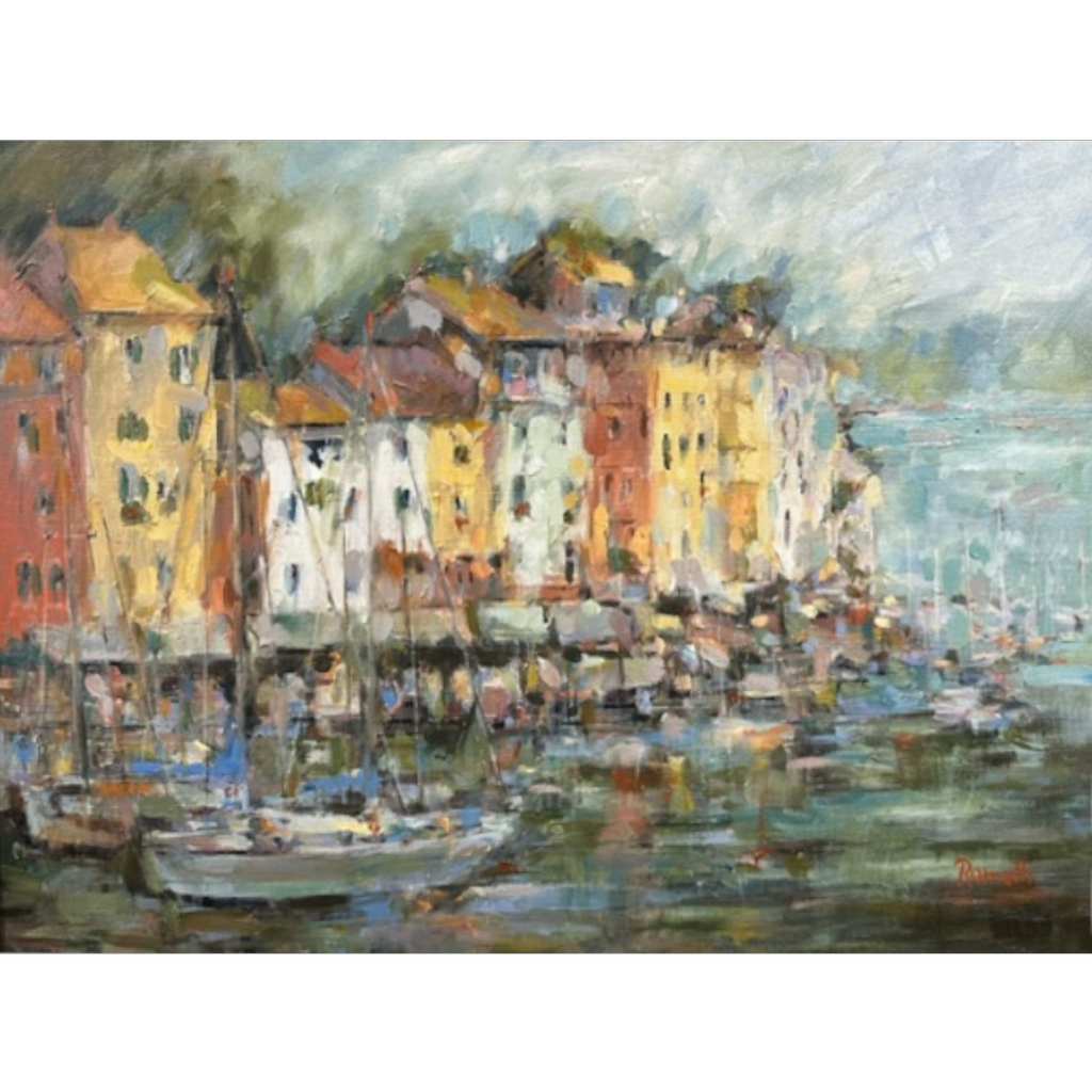“Seaside at the Amalfi Coast” and was created by Patrick Romelli. This mesmerizing oil painting captures the serene and picturesque essence of coastal Italy. The artwork, rich in texture and color, portrays the iconic pastel-colored buildings perched elegantly along the rugged cliffs of Amalfi. Every brushstroke tells a story of timeless beauty, inviting viewers to immerse themselves in a world where nature and architecture exist in harmonious balance. This piece is not only a visual journey to one of Italy’s most beloved destinations but also an exploration into the intricate dance between light, color, and emotion.