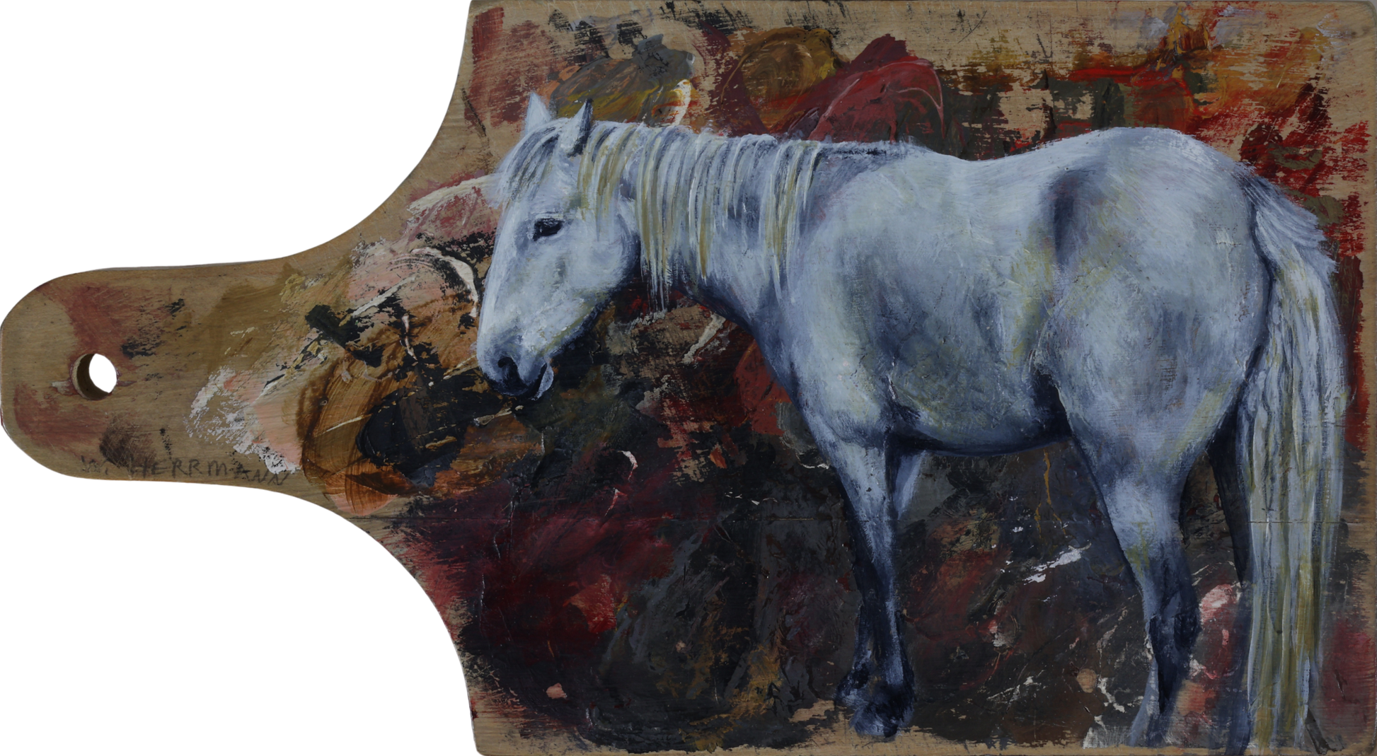 Wendy Herrmann's painting presents a pale grey horse rendered on a uniquely shaped, wooden palette-like surface. The horse, facing left, is depicted in a standing pose with its head slightly lowered, conveying a sense of quietude. The artist employs soft, blended brushstrokes to capture the horse's form and the subtle variations in its coat. The background is a textured mix of earthy tones, including browns, reds, and hints of yellow, creating a dynamic and abstract backdrop that contrasts with the horse's serene demeanor. The unconventional shape of the support, with its rounded edges and a hole in the upper left corner, adds a distinctive, handcrafted quality to the piece, emphasizing the artist's personal touch and the unique nature of the artwork. The overall effect is one of quiet elegance and a celebration of the horse's natural beauty, juxtaposed with the expressive, almost abstract quality of the background.