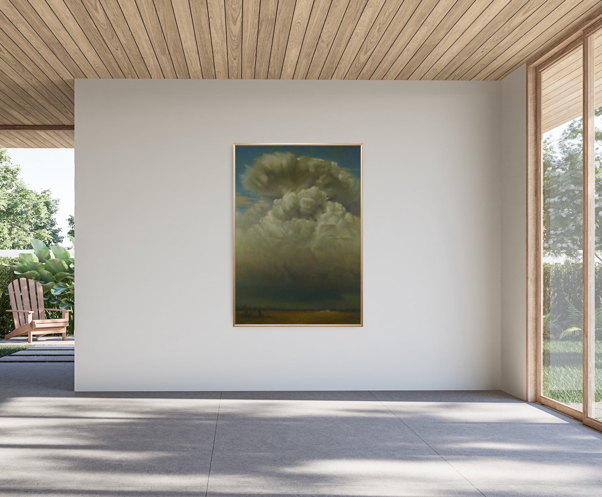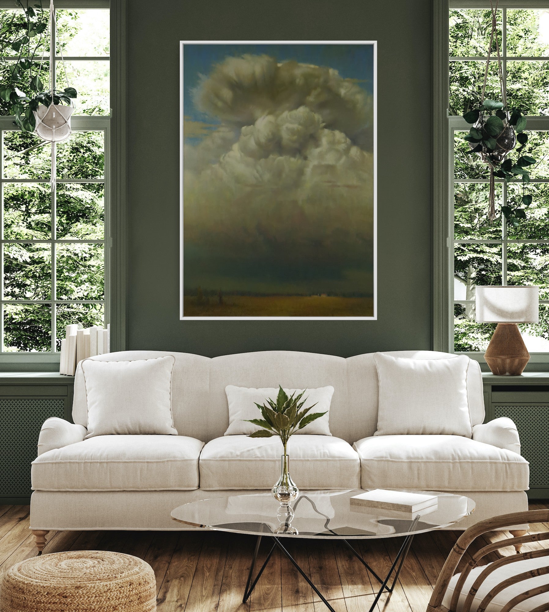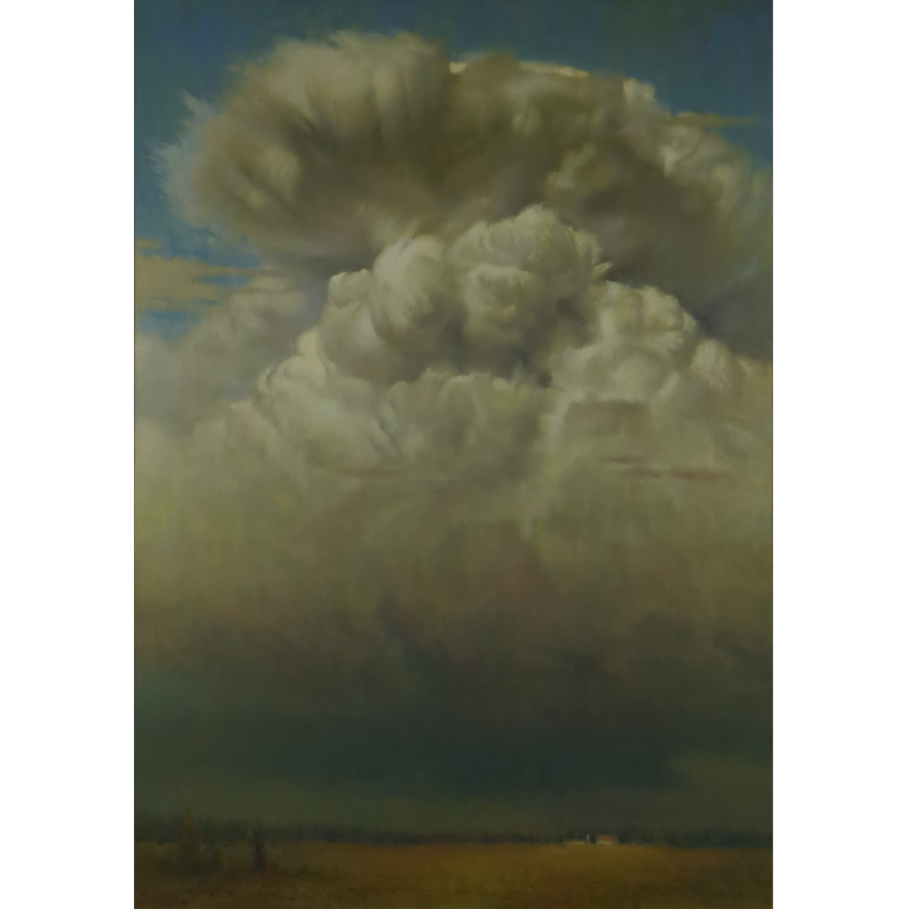 "Storm on the Horizon" by Chuck Marshall: A Captivating Depiction of Nature's Power is a captivating oil painting that masterfully captures the raw power and beauty of nature. The artwork features a dramatic, towering cloud formation dominating the sky, with dark, ominous storm clouds looming over a vast, open landscape. The contrast between the bright, billowing clouds and the dark, foreboding storm creates a sense of impending weather, evoking both awe and tension. The subtle details in the cloud textures and the muted colors of the landscape below add depth and realism to the scene, making it a striking piece that draws the viewer's eye and imagination. This painting is a testament to Marshall's skill in portraying the sublime and ever-changing nature of the sky, making it a must-see for art enthusiasts and collectors alike.