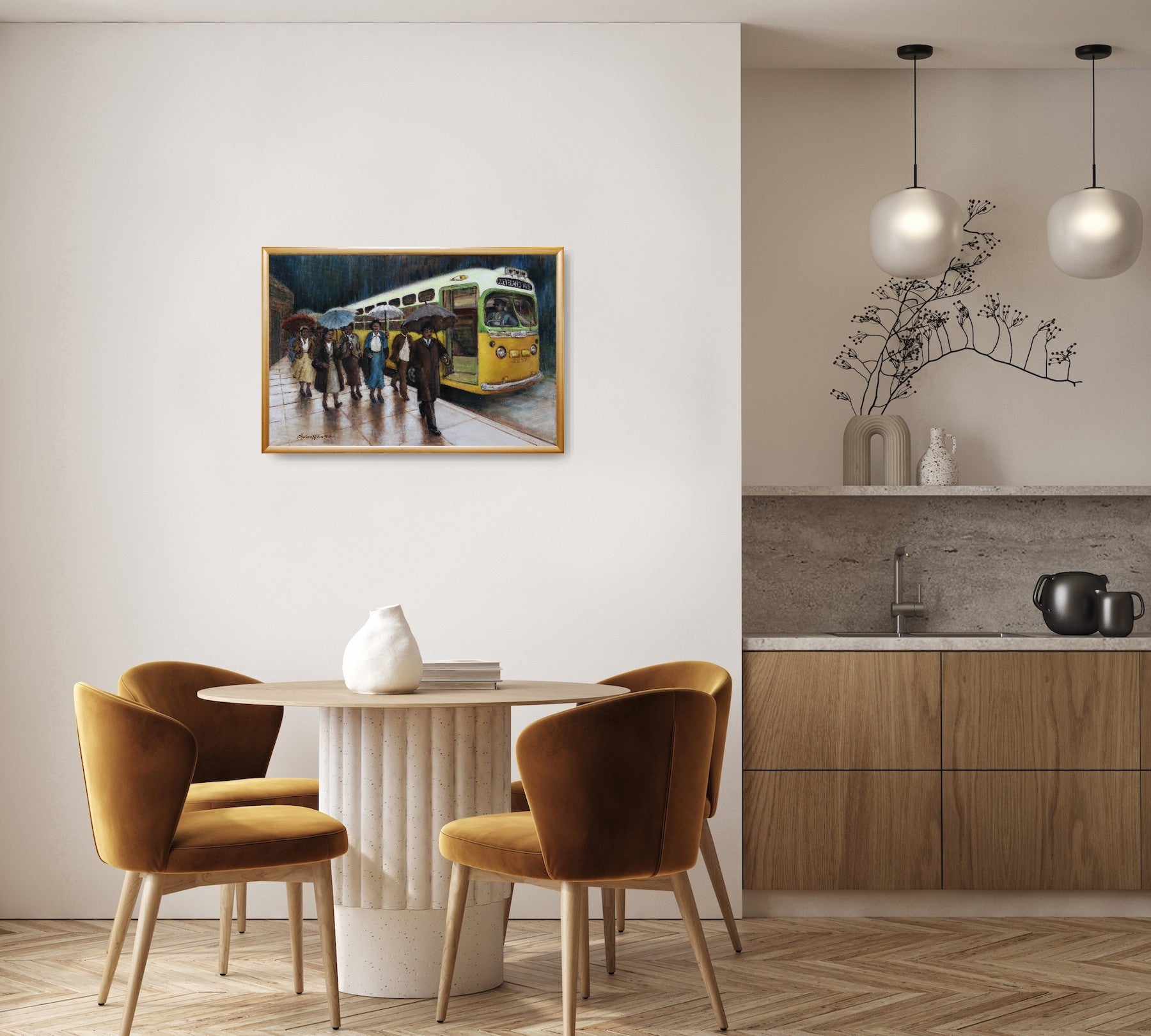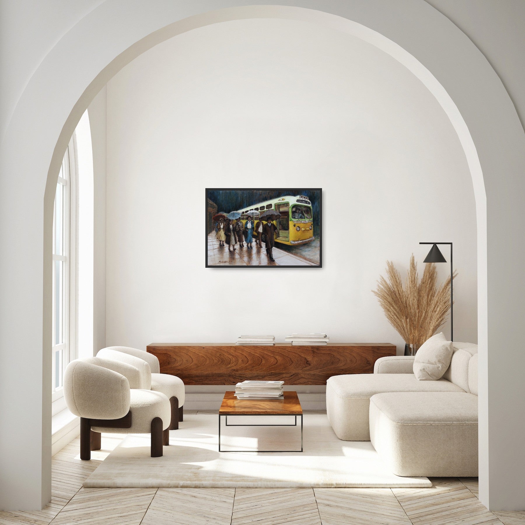 Montgomery Bus Boycott by Marlena Hebenstreit is a stunning oil painting that captures a pivotal moment in the civil rights movement. The painting depicts Martin Luther King Jr and the people of Montgomery, Alabama, walking next to the bus they are boycotting in the rain. The painting shows the determination and courage of the protesters, as well as the contrast between the bright colors of their clothes and the dark clouds above them. The painting is signed by the artist and is available for viewing at The Art Enclave Gallery. This painting is part of a series that showcases the life and legacy of Martin Luther King Jr, one of the most influential figures in American history. If you are looking for a unique and inspiring artwork that celebrates the spirit of freedom and justice, this painting is for you. Order now!