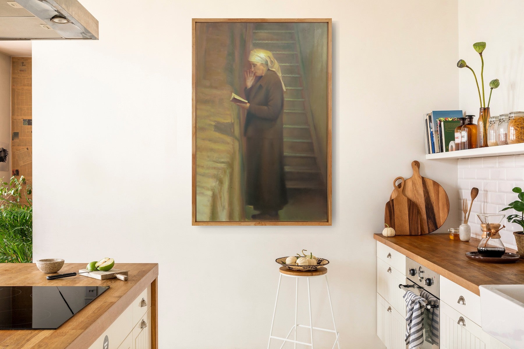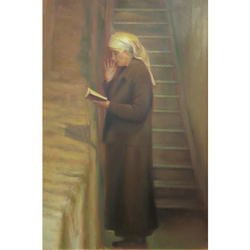 "The Solemn Prayer" by Chuck Marshall is a poignant and evocative painting that captures a moment of deep reflection and spirituality. The artwork depicts a solitary figure standing in a dimly lit narrow stairwell. The figure is dressed in a dark, modest coat and a light-colored headscarf, holding an open book, likely a prayer book or religious text, close to the face. The figure's posture and the raised hand suggest a moment of silent prayer or contemplation. The muted, earthy tones and soft brushstrokes create a serene and introspective atmosphere, drawing the viewer into the intimate moment of devotion. This painting is a beautiful representation of personal faith and the quiet strength found in moments of prayer.