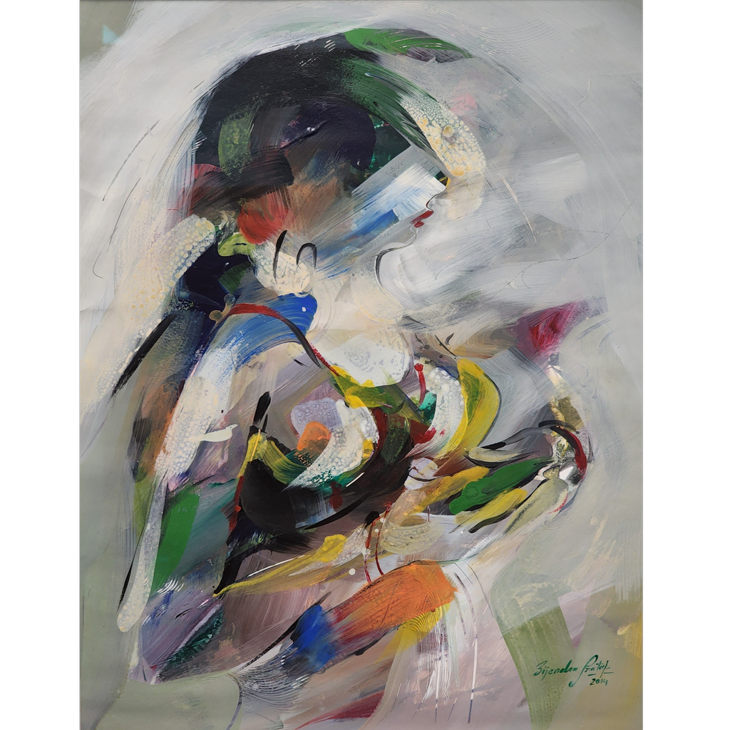 The painting is an abstract work by Bijendra Pratap, a watercolor artist from India. The painting is called The Stance and it depicts a woman in a colorful dress standing in front of a light background. The painting is made with gouache, a type of opaque watercolor, and it is framed in a wooden frame.