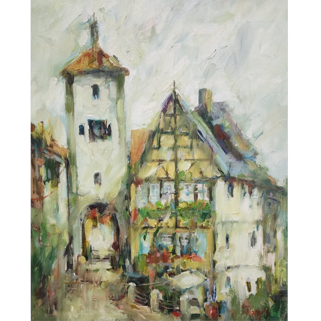 "Tower and Timber House" is an oil painting by Patrick Romelli that depicts a tower and timber house in Rothenburg, Germany. The painting is done in a loose, impressionistic style with a focus on the tower and timber house. The colors are soft and muted, creating a peaceful and serene mood. The painting is a beautiful representation of the architecture and landscape of Rothenburg, Germany.