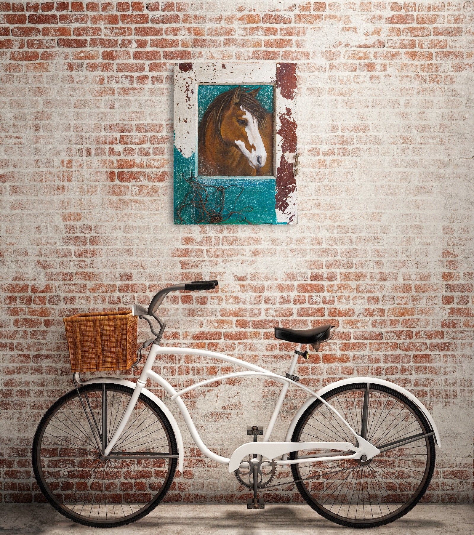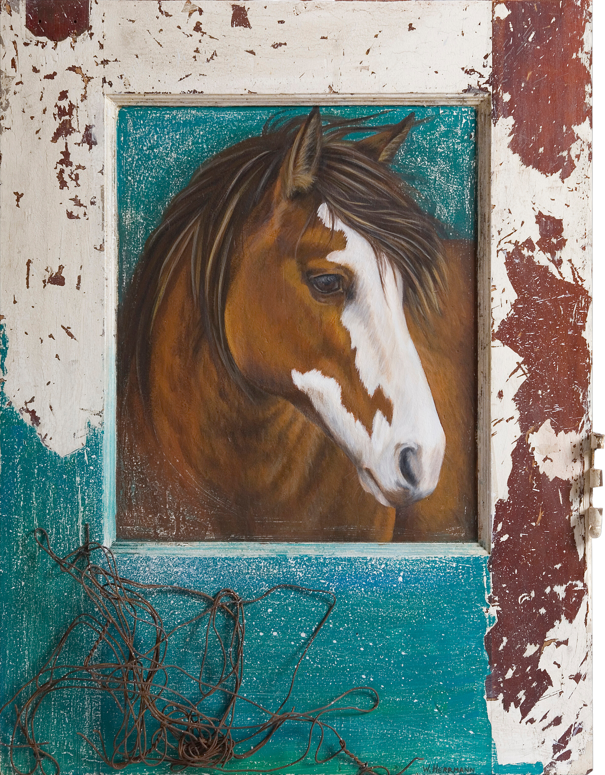 Wendy Herrmann presents a captivating portrait of a chestnut horse, framed within a rustic, repurposed door, creating a unique blend of realism and found-object art. The horse's head, rendered with detailed brushstrokes and a warm palette, is centered within the teal-painted panel of the door, drawing the viewer's attention to its gentle expression and flowing mane. The weathered, distressed texture of the door, with its chipped paint and rusted hardware, adds a sense of history and authenticity to the composition. A tangle of wire at the bottom adds another layer of texture and visual interest. The artist's skillful juxtaposition of the realistic horse portrait with the rustic door creates a compelling narrative, suggesting a story of connection and transformation.