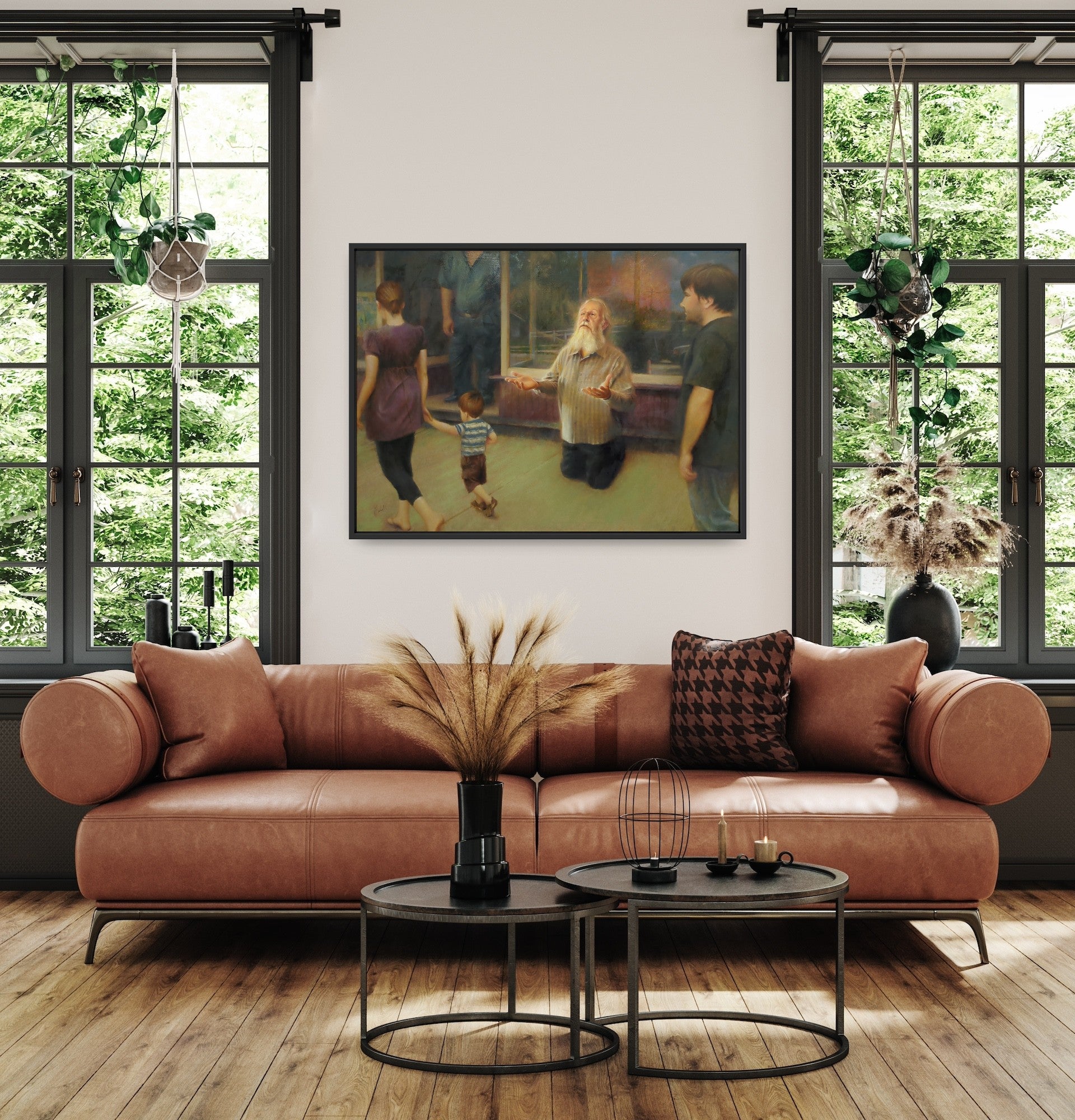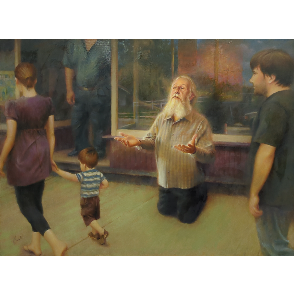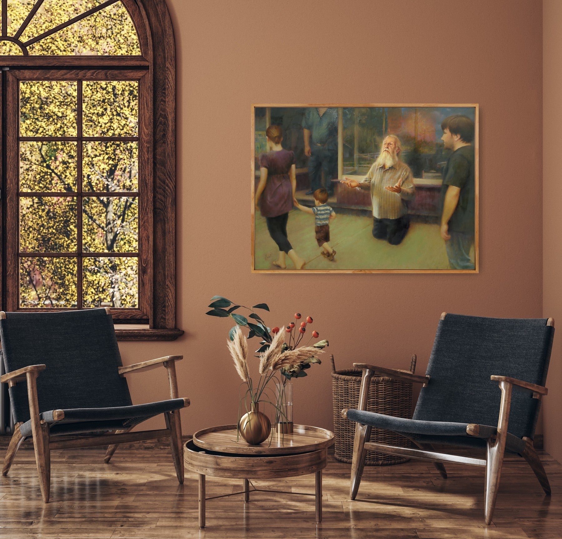 "Unseen" by Chuck Marshall is a captivating painting that masterfully captures a moment of everyday life with a touch of mystery and introspection. The artwork depicts a scene with four figures: a woman, a child, and two men. The woman and child are walking hand in hand, while one man is kneeling with his arms outstretched, and the other man stands nearby. The background suggests an indoor setting with reflections and shadows adding depth and intrigue to the composition. The use of light and shadow, along with the blurred details, evokes a sense of movement and fleeting moments, inviting viewers to ponder the unseen stories and emotions behind the scene. This painting is a beautiful example of Marshall's ability to blend realism with impressionistic elements, making it a thought-provoking addition to any art collection.