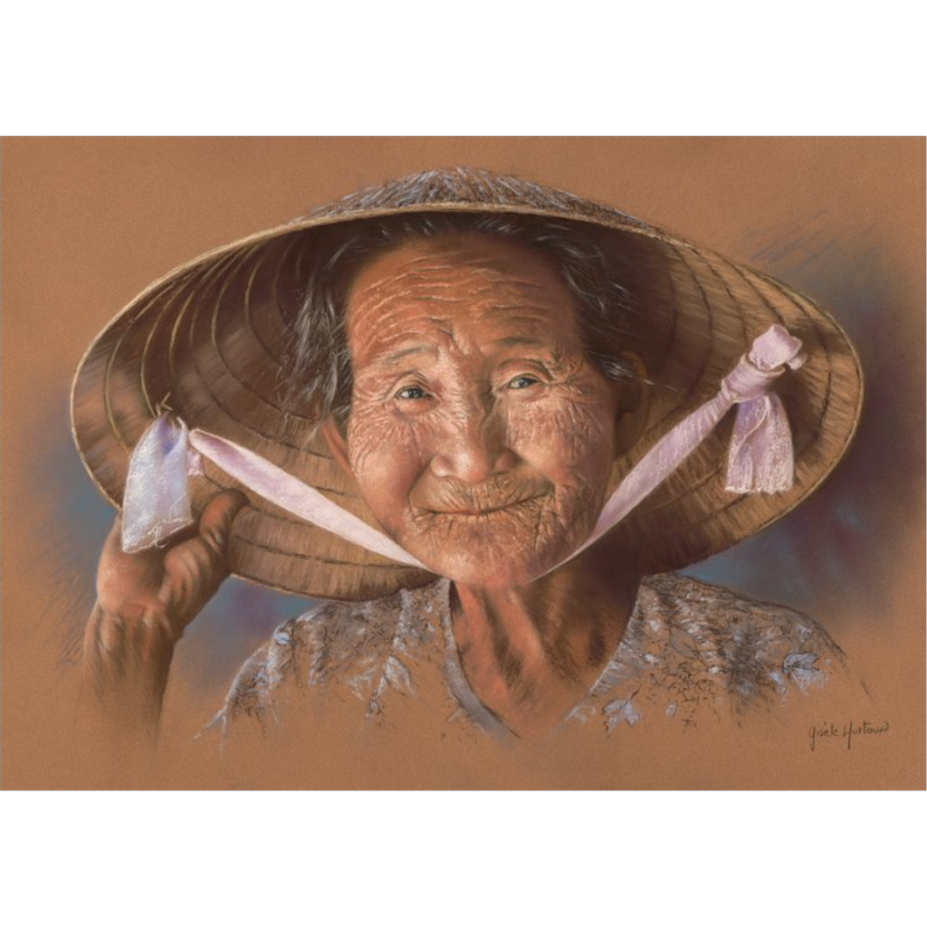 Vietnamese Grandmother by Gisele Hurtaud is a stunning pastel on paper artwork that captures the essence of an elderly woman in a traditional straw hat. The artist uses realistic and vibrant colors to create a striking contrast between the golden-brown background and the straw hat, and the wrinkled face of the grandmother. This painting is inspired by a photograph by Alexandre Sattler, a renowned travel photographer. This painting is a unique and original piece of art that showcases the skill and talent of Gisele Hurtaud, a Haitian French artist who specializes in portraits. This painting is available for purchase at Art Enclave, an online platform that connects art lovers with emerging and established artists from around the world. If you are looking for a captivating and authentic artwork that reflects the culture and history of Vietnam, you will love Vietnamese Grandmother by Gisele Hurtaud. Order now!