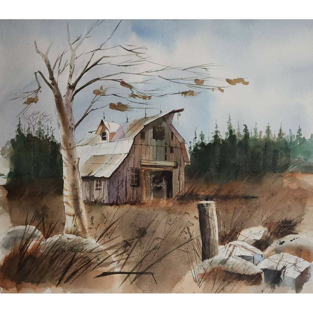 "Weathered Barn" by Paul Sensbach is a watercolor painting of a dilapidated barn in a rural setting. The painting is done in a loose and impressionistic style, with a focus on the textures and colors of the barn and the surrounding landscape. The overall mood of the painting is one of nostalgia and decay.