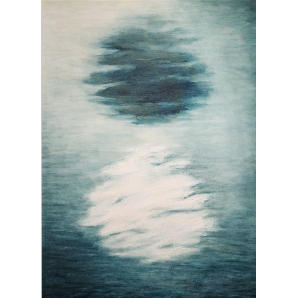 “Yin Yang” by Joseph Sinsabaugh is a captivating oil painting that masterfully embodies the ancient symbol of balance and duality. The artwork features a vertical composition with a seamless gradient from dark to light, creating an abstract representation of the yin and yang symbol. The top half is dominated by a dark, cloud-like form that gradually transitions into lighter shades towards the bottom, where a white, wispy shape mirrors the form above. This contrast between dark and light elements evokes a sense of harmony and tranquility, making it a striking piece for any art collection. The use of texture and gradation adds depth and intrigue, inviting viewers to explore the delicate balance between opposing forces. Perfect for those who appreciate abstract art and the profound symbolism of yin and yang.