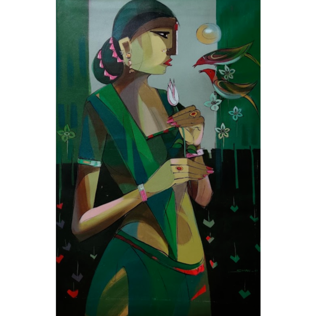 Young Woman in Green by Simpee Pratap is a mid-century modern style painting that captures the beauty and grace of a young Indian woman. The painting uses geometric shapes and strong color choices of greens and yellows to create a striking contrast between the woman and the background. The woman is holding a flower with birds nearby, symbolizing her connection to nature and life. This painting is a perfect addition to any home or office that appreciates art and culture.